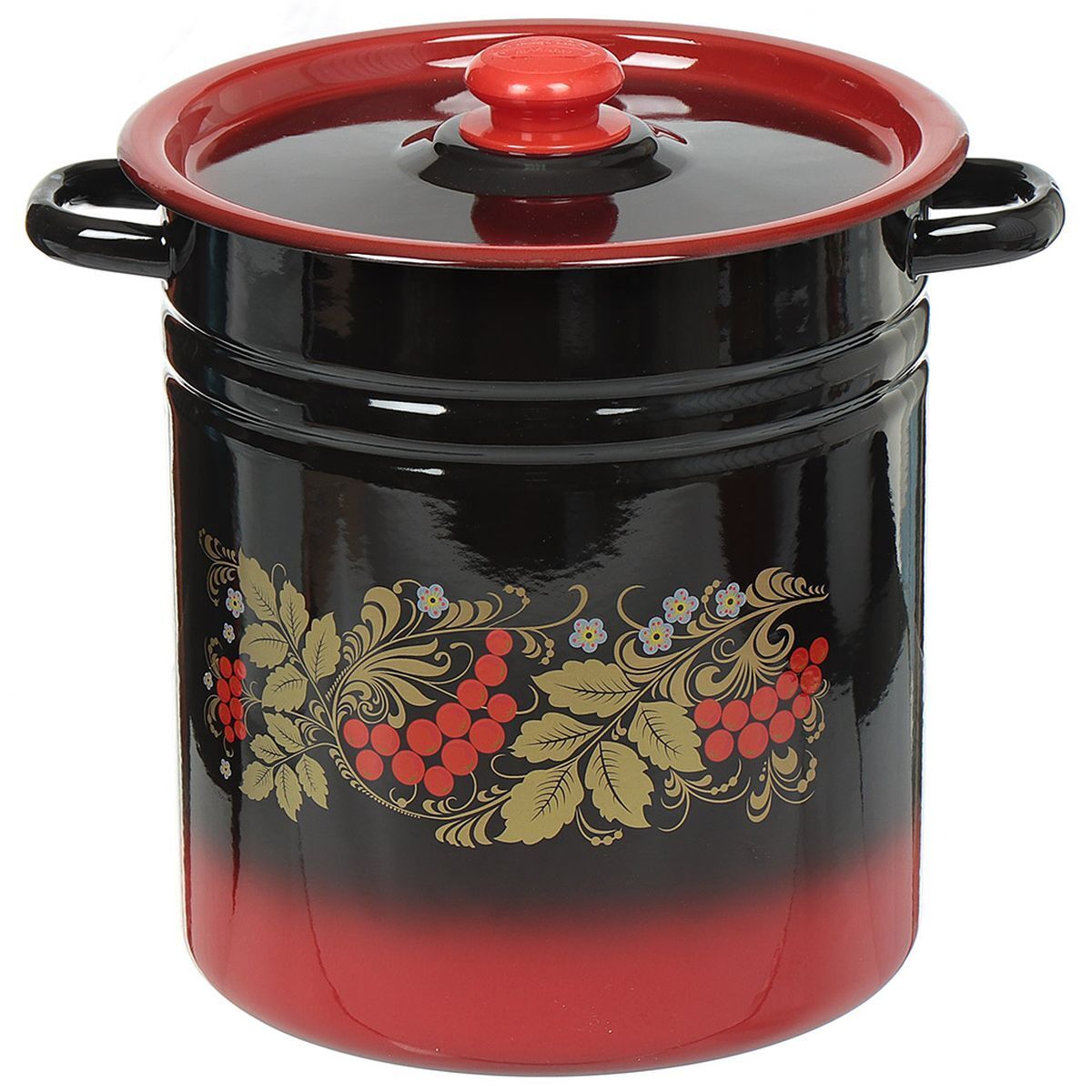 Кастрюля цилиндрической формы Стальэмаль произведена из эмалированной стали, в соответствии с требованиями ГОСТ 24788-2001. Изделие представлено в красно-черных тонах с деколью. На крышке кастрюли расположена пластмассовая ручка-кнопка красного цвета. Кастрюля Стальэмаль имеет приятный внешний вид и прекрасно подойдет для большой семьи благодаря внушительному объему .