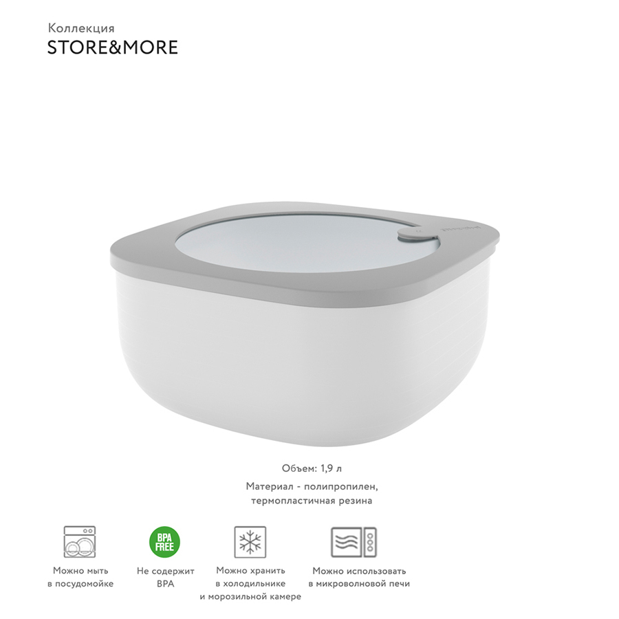 Пищевой контейнер Store&More объемом 1,9 л идеально подходит для использования дома и на открытом воздухе. Посуда предназначена для хранения продуктов в холодильнике или морозильной камере, нагрева в микроволновой печи, транспортировки и подачи блюд. Идея создания пищевого контейнера в форме куба с плавными обтекаемыми углами принадлежит дизайнерской студии Spalvieri & Del Ciotto. Для изготовления емкости мастера используют экологически чистый полипропилен высокой жесткости. Контейнер устойчив к пищевым кислотам и резкой смене температур. Герметичная крышка из термопластичной резины надежно фиксируется и препятствует просыпанию или переливанию еды, что немаловажно для удобной транспортировки. Контейнер можно мыть в посудомоечной машине.