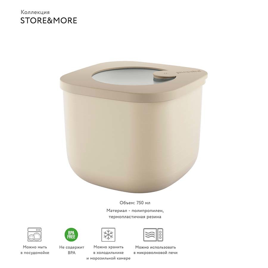 Пищевой контейнер Store&More объемом 750 мл идеально подходит для использования дома и на открытом воздухе. Посуда предназначена для хранения продуктов в холодильнике или морозильной камере, нагрева в микроволновой печи, транспортировки и подачи блюд. Изделие можно взять с собой на дачу, пикник или на работу. Идея создания пищевого контейнера в форме куба с плавными обтекаемыми углами принадлежит дизайнерской студии Spalvieri & Del Ciotto. Для изготовления емкости мастера используют экологически чистый полипропилен высокой жесткости. Контейнер устойчив к пищевым кислотам и резкой смене температур. Герметичная крышка из термопластичной резины надежно фиксируется и препятствует просыпанию или переливанию еды, что немаловажно для удобной транспортировки. Контейнер можно мыть в посудомоечной машине.