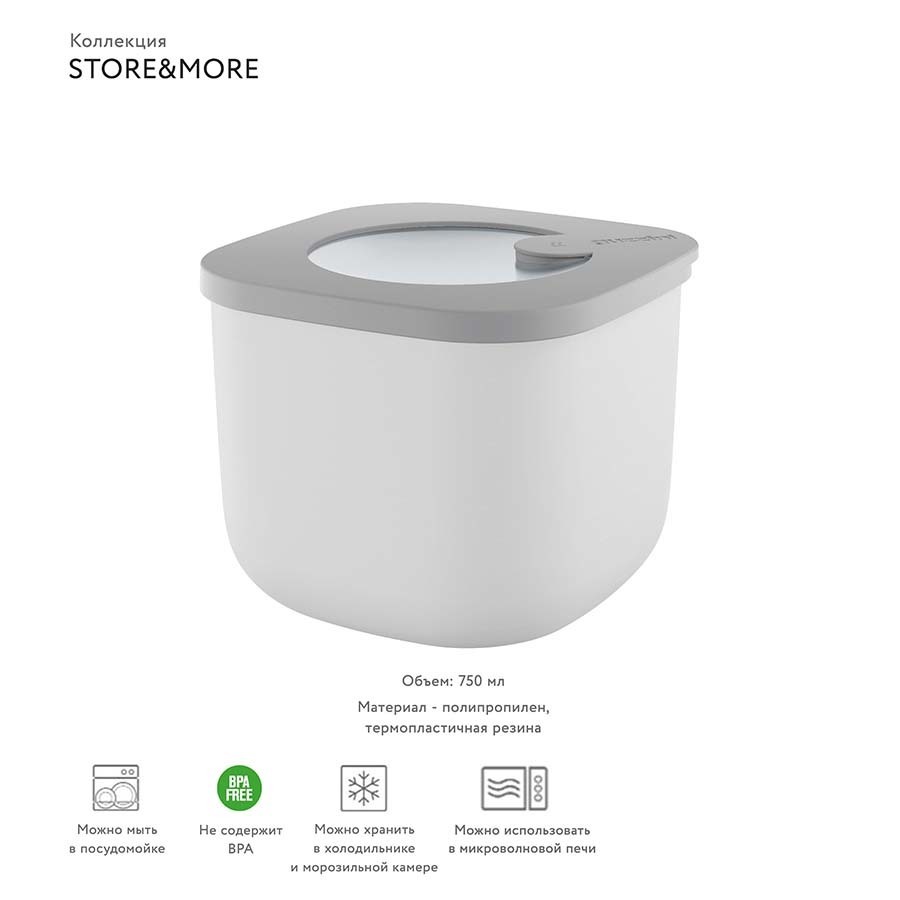 Пищевой контейнер Store&More объемом 750 мл идеально подходит для использования дома и на открытом воздухе. Посуда предназначена для хранения продуктов в холодильнике или морозильной камере, нагрева в микроволновой печи, транспортировки и подачи блюд. Изделие можно взять с собой на дачу, пикник или на работу. Идея создания пищевого контейнера в форме куба с плавными обтекаемыми углами принадлежит дизайнерской студии Spalvieri & Del Ciotto. Для изготовления емкости мастера используют экологически чистый полипропилен высокой жесткости. Контейнер устойчив к пищевым кислотам и резкой смене температур. Герметичная крышка из термопластичной резины надежно фиксируется и препятствует просыпанию или переливанию еды, что немаловажно для удобной транспортировки. Контейнер можно мыть в посудомоечной машине.