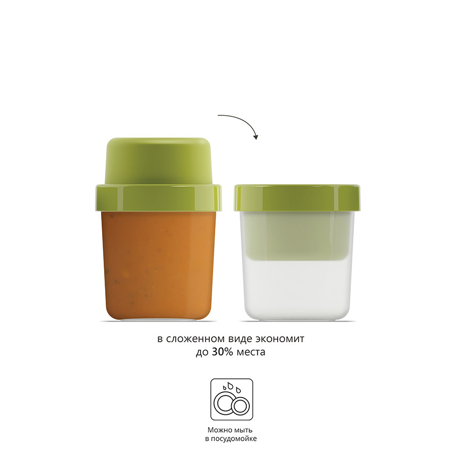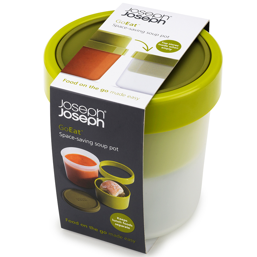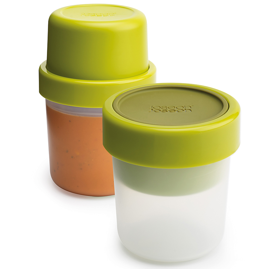 Основной контейнер вмещает до 600 мл жидкости, а небольшое верхнее отделение прекрасно подойдет для хлеба или гренок. Части контейнера отделены друг от друга герметичной силиконовой крышкой, которая плотно фиксируется блокирующим кольцом. Пустые контейнеры можно сложить один в другой, чтобы сэкономить место в сумке.