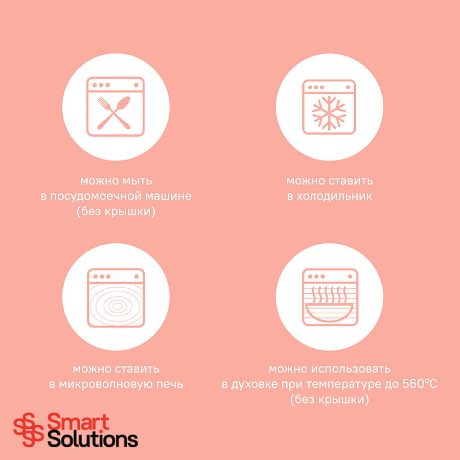 Можно мыть в посудомоечной машине, ставить в морозильную камеру и микроволновую печь. В духовке использовать без крышки при температуре до 560?.