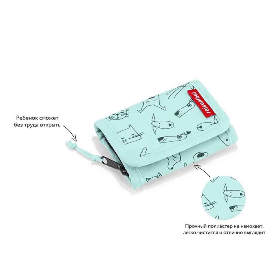 Практичный кошелек для организованных детишек и тех, кто только собирается такими стать! Неважно, что на самом деле будет храниться внутри: настоящие монетки, билетики кино или забавные наклейки - ни одна вещь не просочится сквозь отделение на молнии и супернадёжную липучку Velcro. Для раздельного хранения предметов в кошельке предусмотрены 2 небольших отсека и прозрачное окошко. К собачке на молнии привязан аккуратный шнурок, чтобы избежать дополнительных трудностей при открывании и закрывании кошелька. Материал: прочный водоотталкивающий полиэстер премиум класса. Cats and dogs — уникальная коллекция принтов, которая была создана дизайнерами Reisenthel совместно с учениками детских художественных школ. Сумки, рюкзаки, дождевики, кошельки, пеналы и косметички украшены забавными кошками и собаками и представлены в двух стильных цветах: розово-персиковом и мятно-зелёном. Коллекция порадует не только юных поклонников моды, но и их родителей: все предметы выполнены из водонепроницаемых тканей, которые легко поддаются чистке.