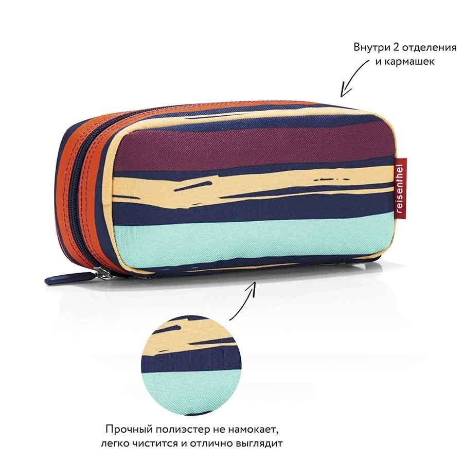 Удобная и вместительная косметичка, которую можно использовать как пенал. Застегивается на молнию. Два внутренних кармана и один плоский, также застегивается на молнию. Внутренний объем - 1,5 литра.