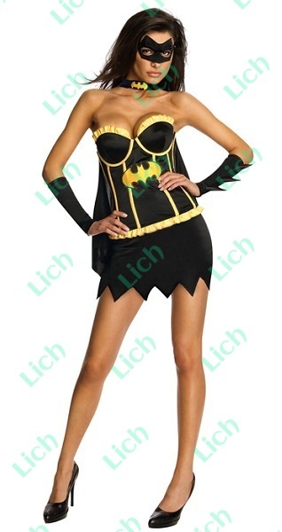 Когда на вас этот чёрно-жёлтый костюм с эмблемой летучей мыши, всем становится понятно, что такой красавицы достоин только Бэтмэн. Мужественный, сильный, умный и смелый… Любой мужчина на Хэллоуин-вечеринке будет готов продать душу дьяволу, чтобы стать таким ради вас! Костюм состоит из платья с подвязками, накидки-плаща, нарукавников, маски.