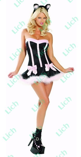 Ради сладкого «муррр» этой красавицы-кошечки, ради касания её шубки к телу и возбуждающего урчания любой мужчина будет готов на всё! Ушки торчком, длинные коготки, в глазах – неприкрытый интерес. И как не подойти? Надевая этот чёрно-розовый наряд с бантиками и опушкой на подоле, будьте готовы к тому, что на Halloween-party к вам выстроится целая очередь любителей кошачьих. Костюм состоит из платья, ушек.