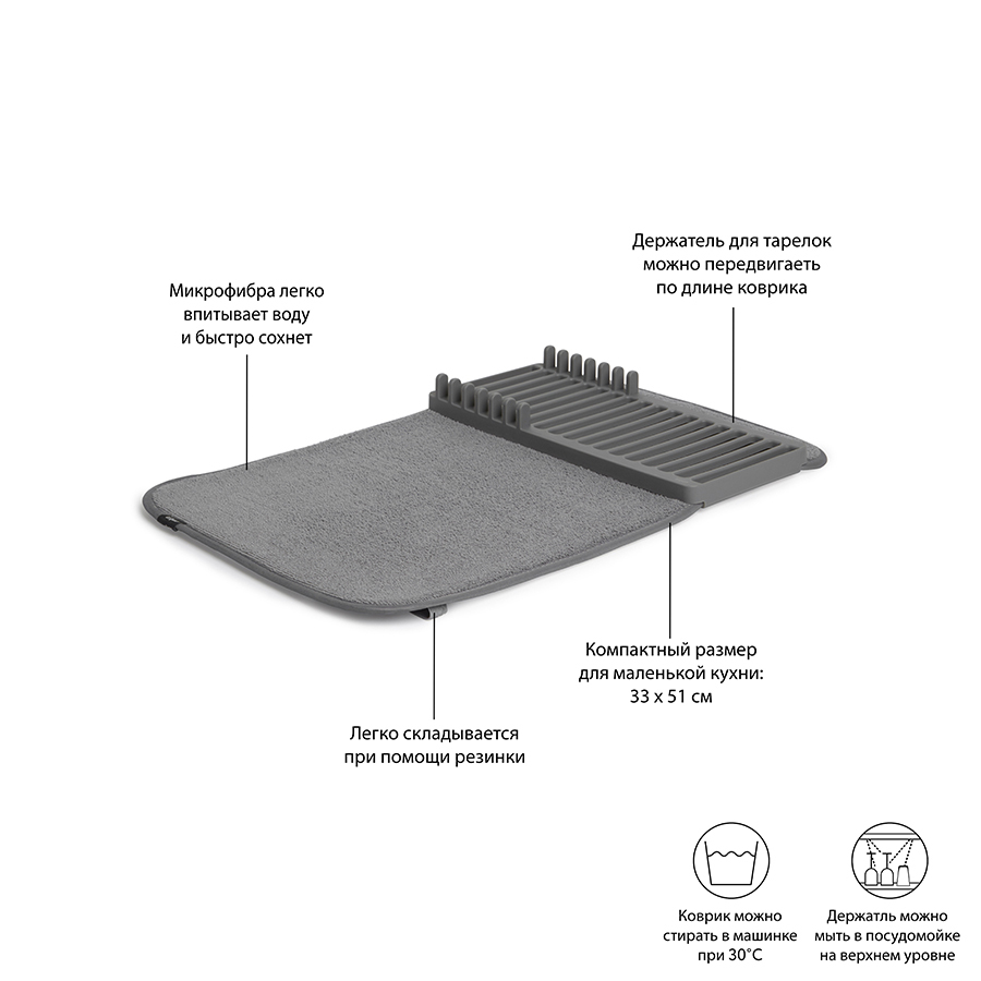 Коврик удобен для сушки чашек, стаканов и глубоких мисок, а подставка – для тарелок и блюдец. Легко разбирается для удобной чистки. Для хранения компактно складывается и закрепляется с помощью эластичных завязок.