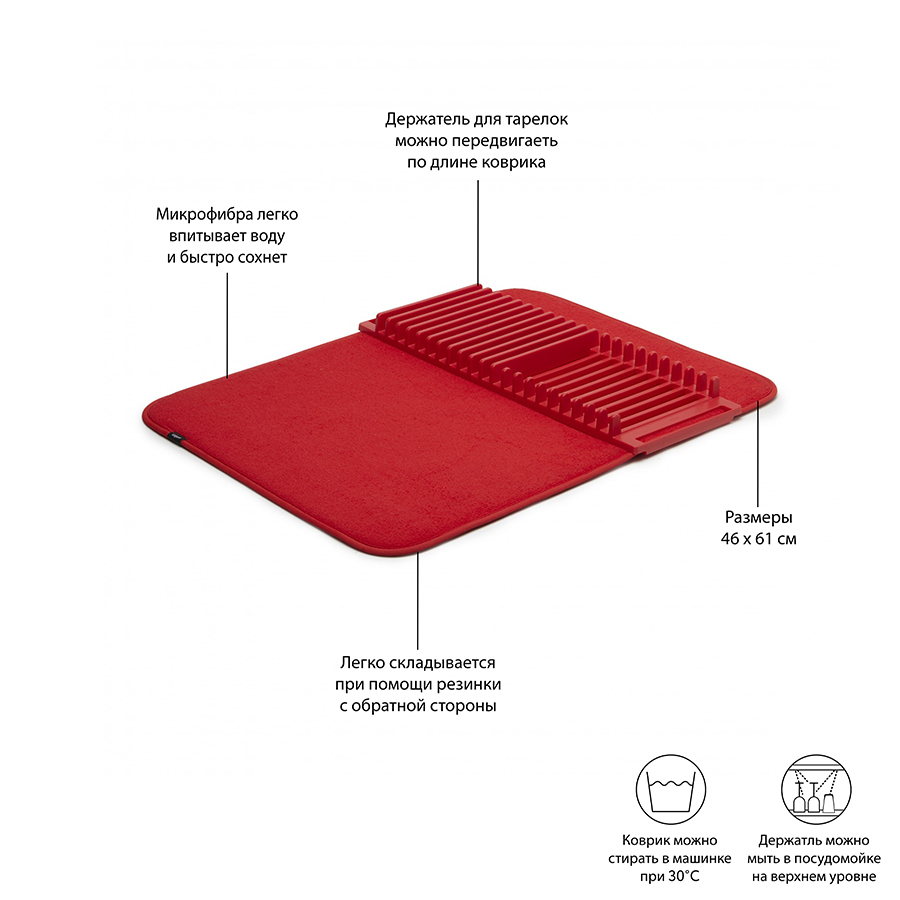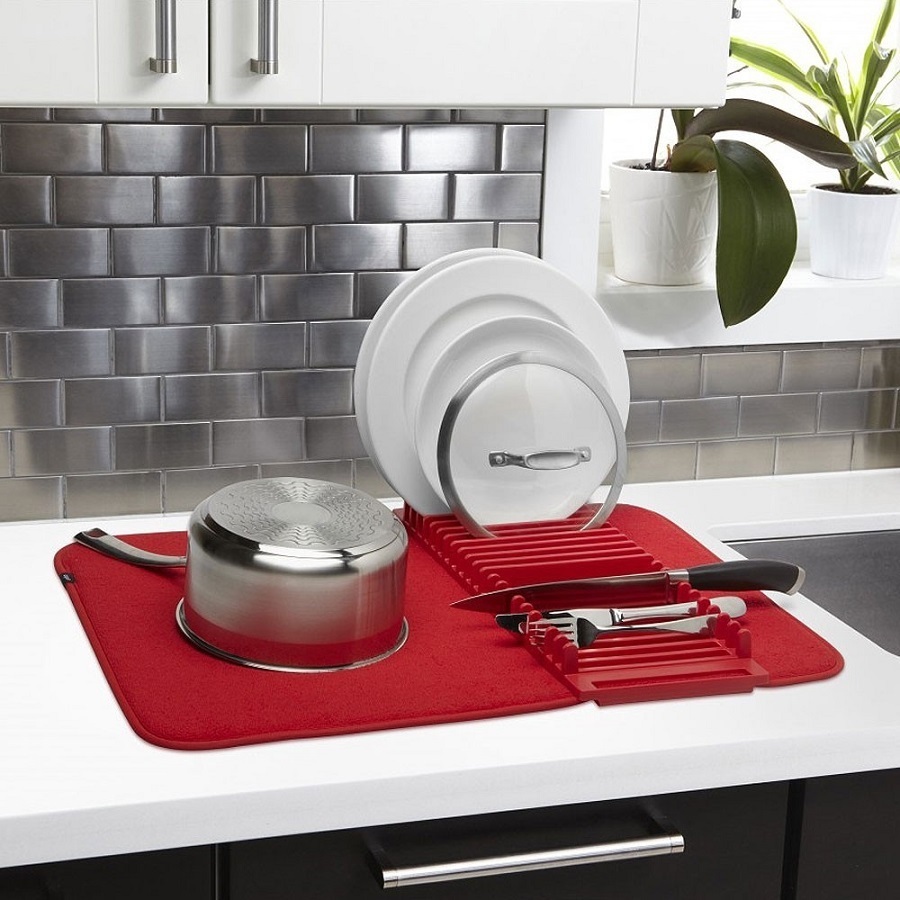 Практичное решение для сушки посуды и столовых приборов после мытья. Коврик выполнен из микрофибры, которая быстро сохнет, посуда с нее не соскальзывает, а удобный пластмассовый держатель позволит поставить крышки и тарелки в вертикальное положение, чтобы капли воды быстрее стекли. После использования коврик складывается для компактного хранения. Размер: 60х46 см