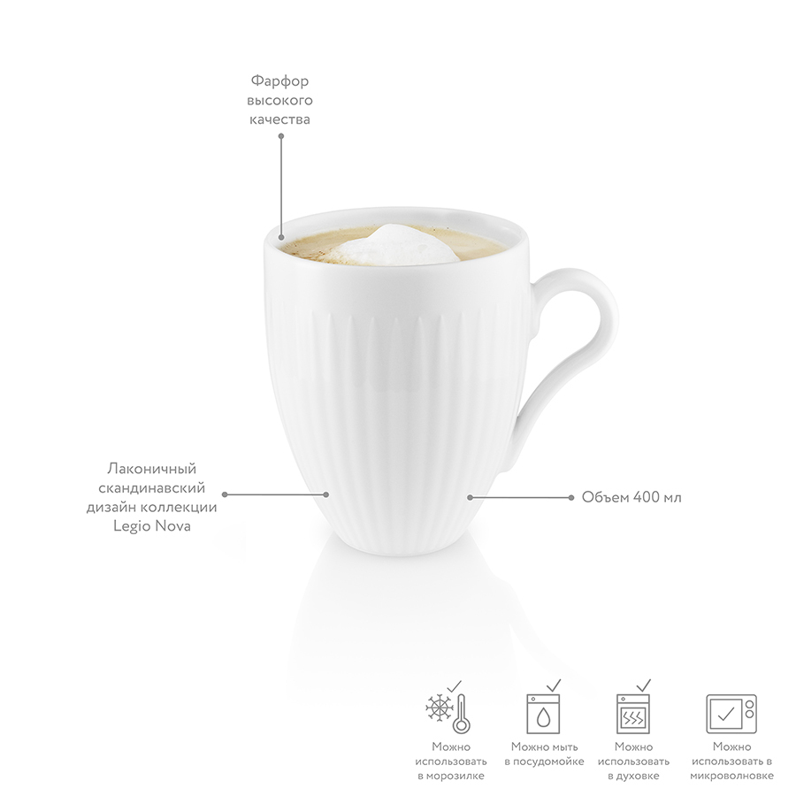 Объем кружки составляет 400 мл, благодаря чему она прекрасно подойдет для согревающего чая, теплого пунша, глинтвейна или ароматных кофейных напитков. Кружка выполнена из высококачественного фарфора. Благодаря плавной обтекаемой форме и изогнутой ручке кружку удобно держать в руке.