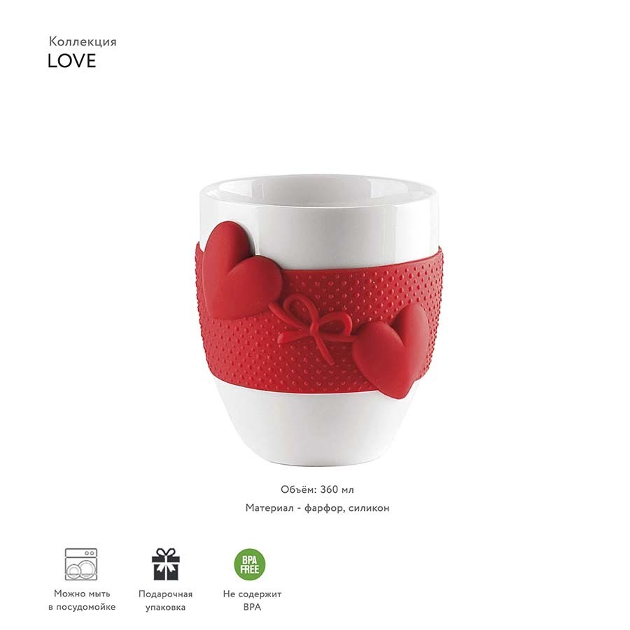 Кружка из фарфора с силиконовой вставкой с очаровательными сердцами подойдет для подачи горячих напитков. Объём 360 мл. Чашки и кружки из коллекции LOVE созданы специально для уютных вечеров с горячим кофе, чаем или какао, что бы можно было неторопливо грея руки наслаждаться любимым напитком. Комбинируйте разные цвета различных предметов коллекции для создания гармоничной композиции. Коллекция LOVE от Guzzini — это ода возвышенным чувствам и тренду на милые аксессуары. Все предметы коллекции упакованы в красивые коробки и станут отличным подарком всем девочкам, вне зависимости от возраста.