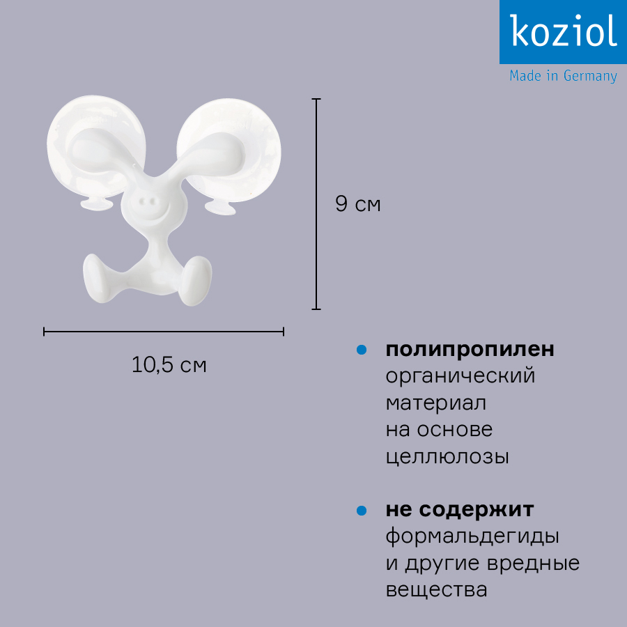 Крючок легко крепится к стене с помощью присосок, которые входят в комплект. Изделие хорошо держится на гладких поверхностях. Крючок выполнен из переработанного пластика.
