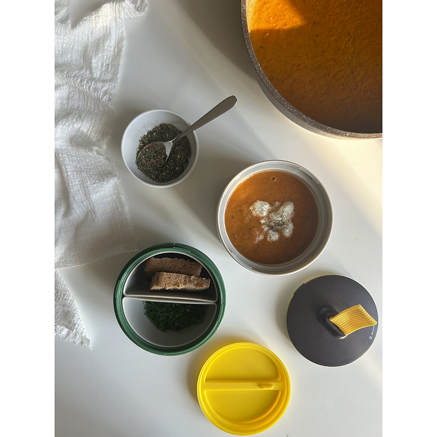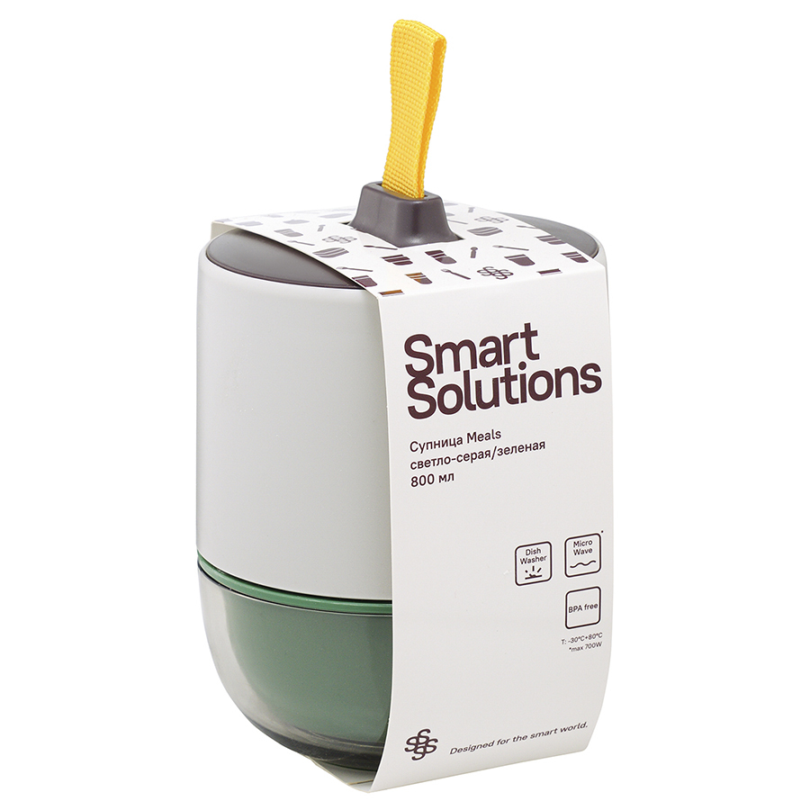 Ланч-бокс Meals от бренда Smart Solutions представляет собой удобный и практичный контейнер для еды с собой. Изделие выполнено из устойчивых к износу и безопасных для здоровья материалов, таких как АБС-пластик и полипропилен. В составе отсутствует вредный бисфенол-А. Конструкция ланч-бокса состоит из двух частей, надежно соединенных между собой. Верхний контейнер идеально подходит для салатов и вторых блюд. Нижний поделен на два отсека, которые можно использовать под фрукты, мюсли и снеки. Специальный ободок из силикона обеспечивает плотное прилегание крышки и защиту от протекания. Однако не рекомендуется переворачивать или трясти контейнер. Благодаря термостойким свойствам емкости можно греть в СВЧ и хранить в холодильнике. Ланч-бокс легко разбирается на составляющие части для тщательной очистки. Перед применением рекомендуем промыть контейнер в горячей воде. Стрелка на крышке указывает направление закрывания контейнера.