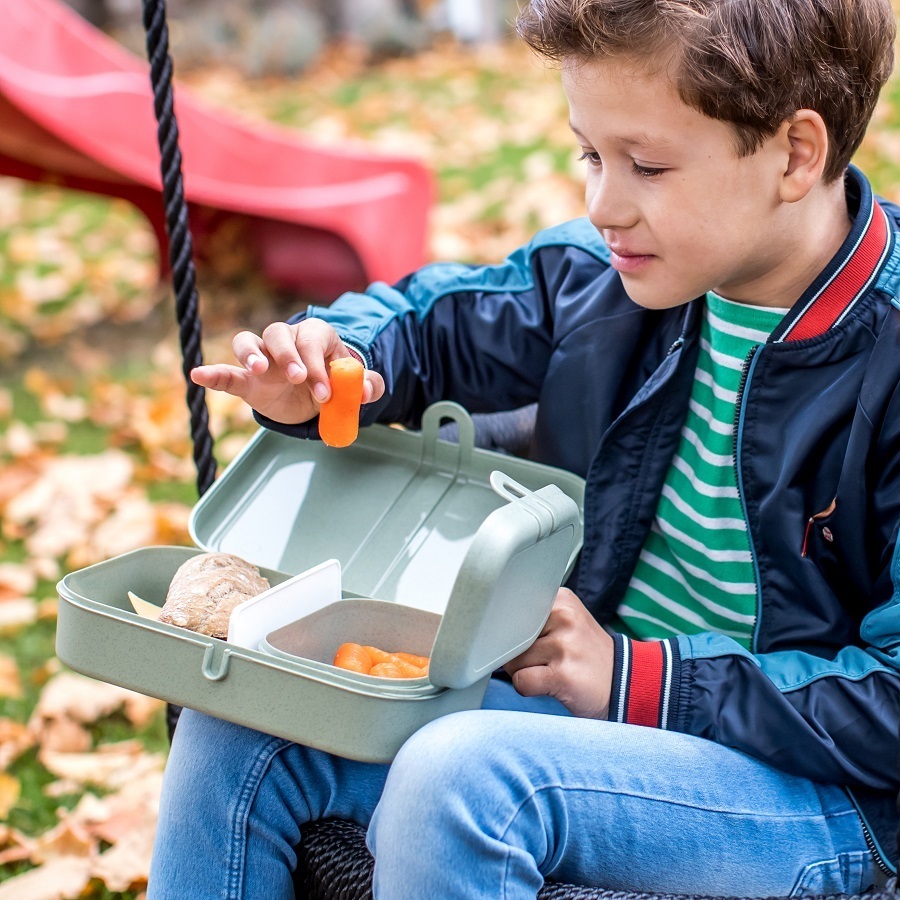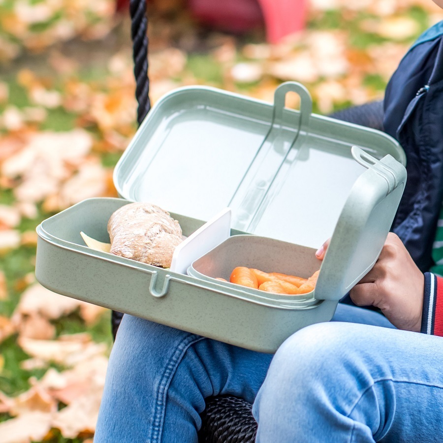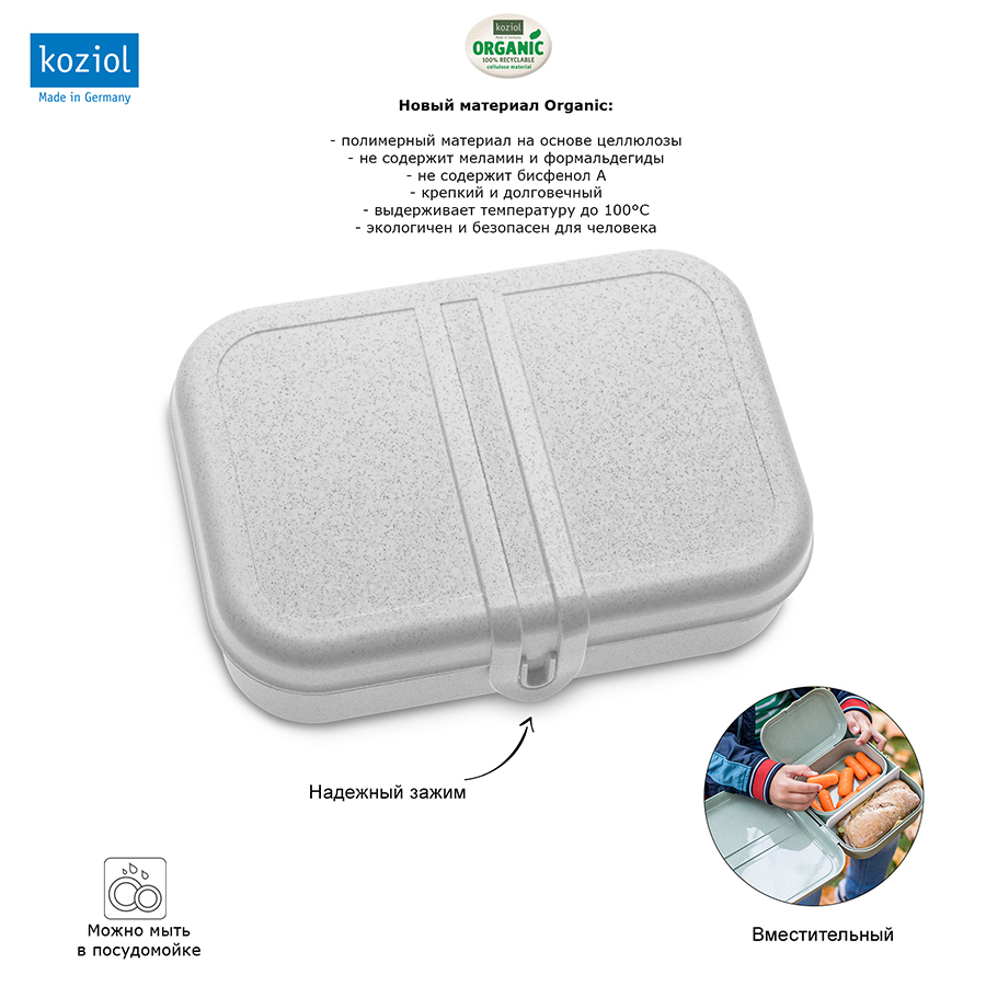 Ланч-бокс PASCAL L – вместительная коробка для школьных обедов или перекусов на работе. За счет обтекаемой формы и плавных линий емкость можно переносить в сумке или рюкзаке без риска повредить тетради, документы или другие важные предметы. Бокс вмещает бутерброды, орехи, печенье, фрукты и другие закуски. Изготовлен из органического материала на основе целлюлозы, не содержит формальдегидов, бисфенола А. Ланч-бокс можно мыть в посудомоечной машине. Особенности: - надежный зажим - вместительное внутреннее отделение Производство: Германия