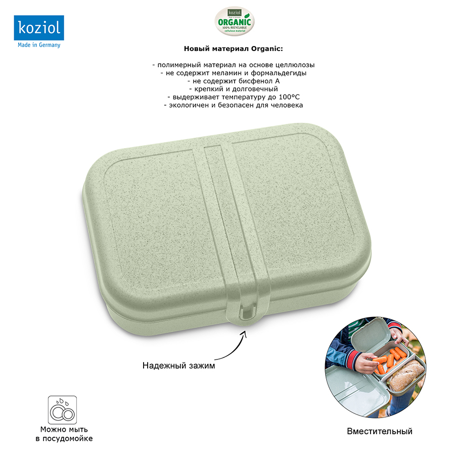 Ланч-бокс PASCAL L – вместительная коробка для школьных обедов или перекусов на работе. За счет обтекаемой формы и плавных линий емкость можно переносить в сумке или рюкзаке без риска повредить тетради, документы или другие важные предметы. Бокс вмещает бутерброды, орехи, печенье, фрукты и другие закуски. Изготовлен из органического материала на основе целлюлозы, не содержит формальдегидов, бисфенола А. Ланч-бокс можно мыть в посудомоечной машине.