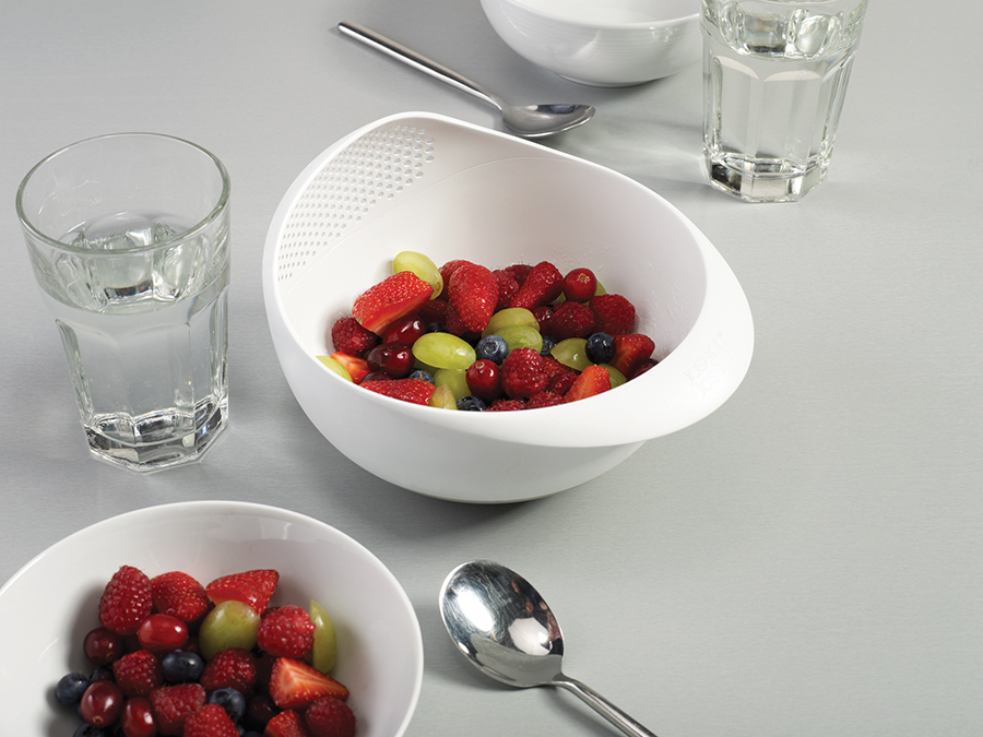 Миска сочетается с дуршлагом, выполняя сразу несколько функций. Избавляет от необходимости держать под рукой сразу множество ёмкостей. Фрукты, овощи, крупы можно промывать водой прямо в миске (для слива достаточно наклонить ее под небольшим углом), а затем — сразу же подавать на стол. Эргономичные рукоятки обеспечивают дополнительный комфорт, а нескользящее основание — идеальную устойчивость. Можно мыть в посудомоечной машине. Не подходит для использования в микроволновой печи!