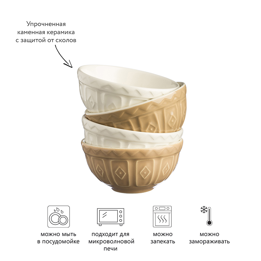 Для производства изделий используется жаростойкая каменная керамика. Благодаря этому чаши отличаются надежностью и длительным сроком службы. Поверхность посуды покрыта высокопрочной глазурью, на которой не остается царапин от металлических кухонных приборов. В набор входят 2 кремовые чаши объемом 200 мл и 2 белые чаши объемом 200 мл. Размер одной чаши: 5,1х9,4х9,4 см. Вес одной чаши: 0,2 кг.