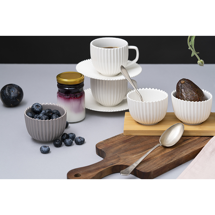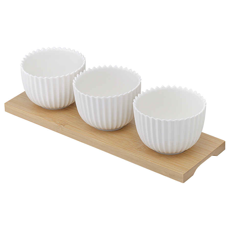 Набор для сервировки состоит из трех белоснежных фарфоровых чаш и подставки из полированного бамбука. Такой набор идеально подойдет для подачи закусок, соусов или сладостей к праздничному столу или семейному ужину. Глянцевая фарфоровая поверхность чаш имеет рифленую фактуру, что добавляет сервировке легкости и утонченности. При этом чаши очень практичны: не царапаются, не меняют цвет и легко моются. Этот набор прекрасно сочетается с другой посудой из коллекции Edge, в которой есть тарелки, чашки, салатники, сахарницы и другие предметы.