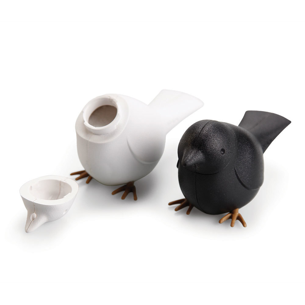 Птицы на столе выглядят оригинально и необычно, особенно, если речь идет о наборе для специй. Плотная крышка предотвращает попадание воздуха к пряностям, поэтому они хранятся длительное время. Чтобы воспользоваться ароматной смесью, нужно просто снять верхнюю часть головы птицы. В комплект входит две емкости разного цвета, это помогает ориентироваться при выборе специй.