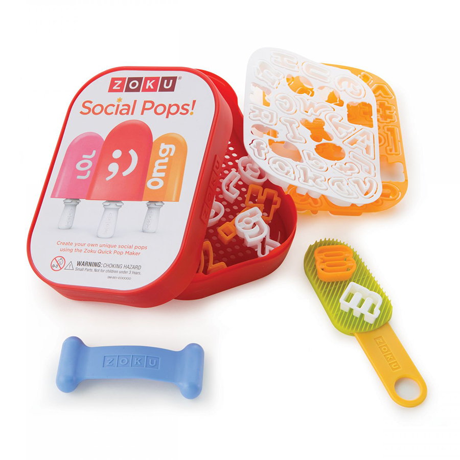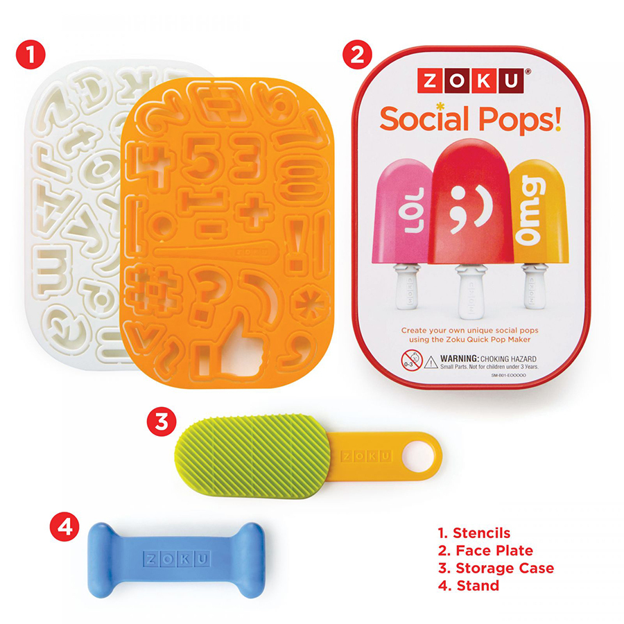Создавайте оригинальные десерты с помощью набора Social Media Kit, украшая их забавными надписями, аббревиатурами, смайликами и лайками! Теперь каждая порция будет иметь свое уникальное оформление, позволяя вам легко определить, какой из замороженных соков кому принадлежит. Порадуйте своих друзей и знакомых не только вкусными, но и красивыми домашними десертами! Набор включает в себя: - 49 трафаретов; - 1 палочка для фруктов; - 1 «лицевую» пластину; - 1 подставку; Для создания собственных украшений нарежьте любой фрукт тонкими ломтиками, выберите нужный трафарет и выдавите его с помощью специальной палочки. Нанесите полученный узор на лицевую пластину и вставьте ее в любой охлажденный заранее Quick Pop Maker. Форма должна стоять на боку на подставке. Прижмите пластину к верхнему краю и подержите так 15-30 секунд. После этого готовьте мороженое как обычно. Не содержит вредных примесей и бисфенола-А. Моется вручную.