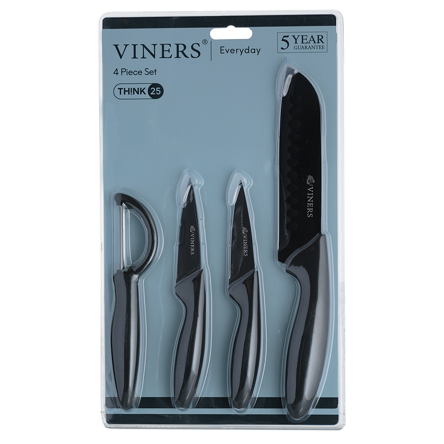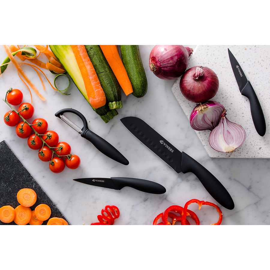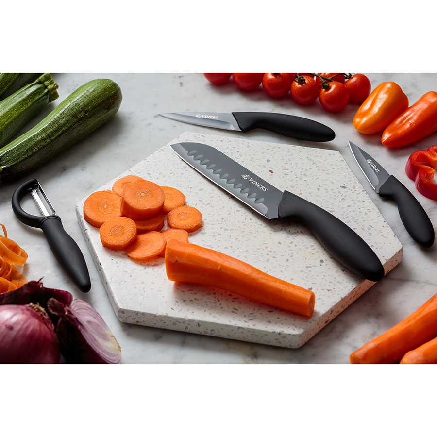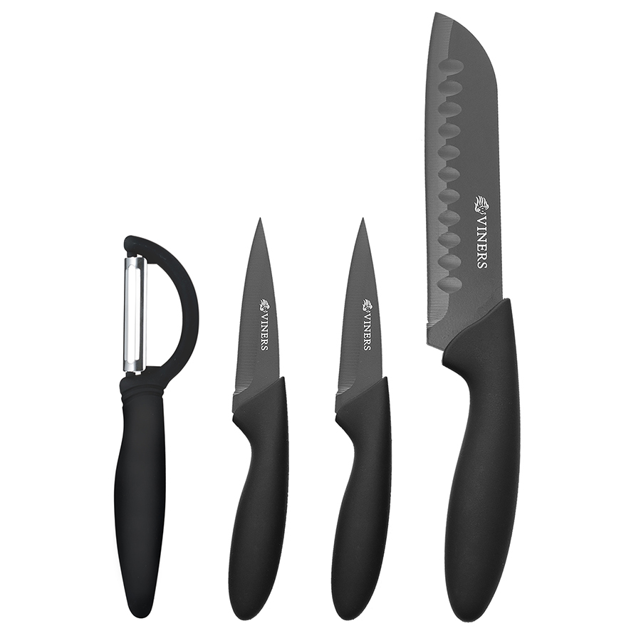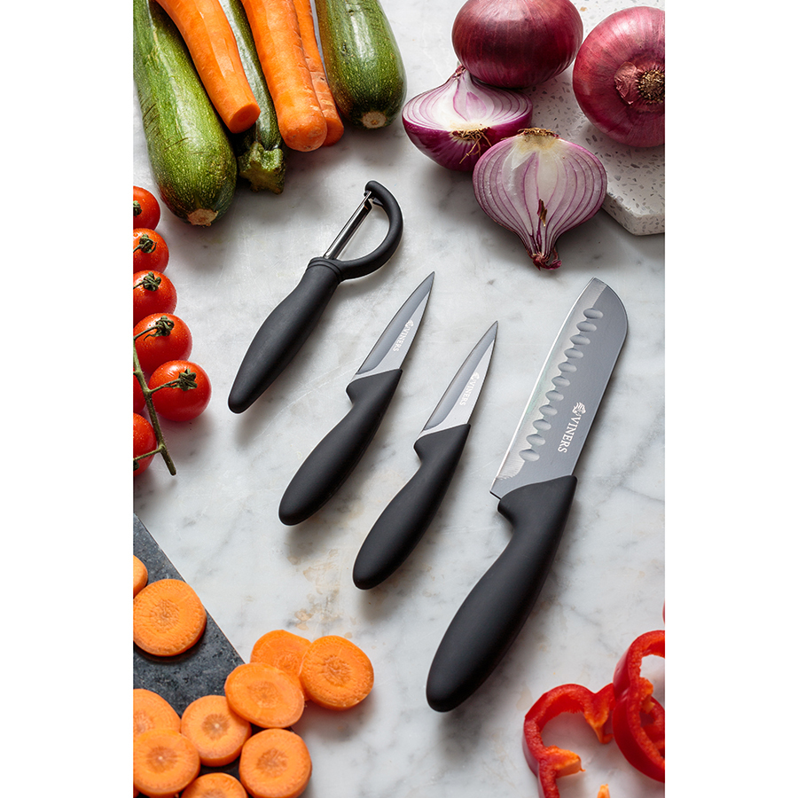 В комплект входят два ножа для чистки овощей по 9 см, нож сантоку 12,5 см и овощечистка. Ручки с мягким покрытием "soft touch" обеспечивают комфортное использование без выскальзывания. Лезвия выполнены из качественной нержавеющей стали.