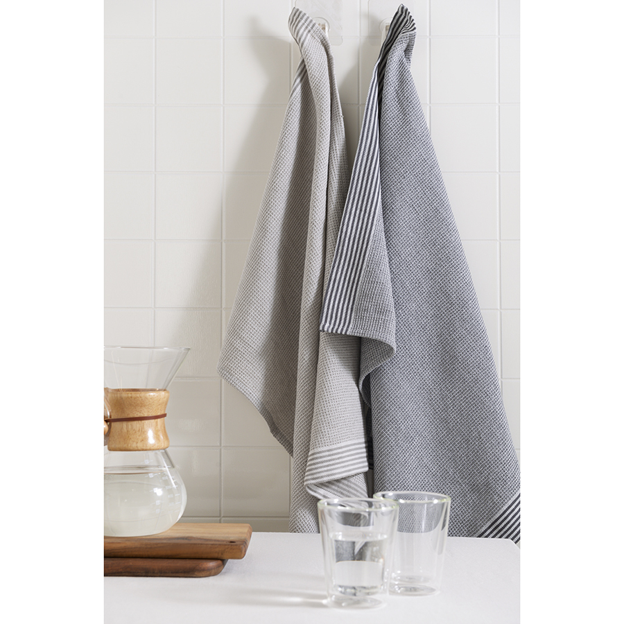Набор из двух вафельных полотенец с контрастным кантом из коллекции Essential станет помощником на кухне и настоящим украшением интерьера. Изделия выполнены из 100% хлопка в двух нейтральных оттенках серого и отделаны стильным полосатым бело-серым кантом по двум сторонам. Полотенца вафельной фактуры прочны и очень практичны — хорошо впитывают влагу и быстро сохнут. Для подвешивания на крючок есть удобная петелька.