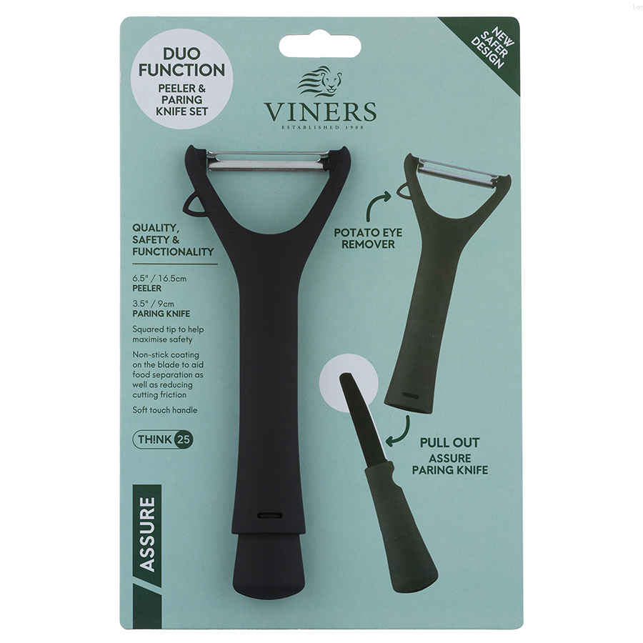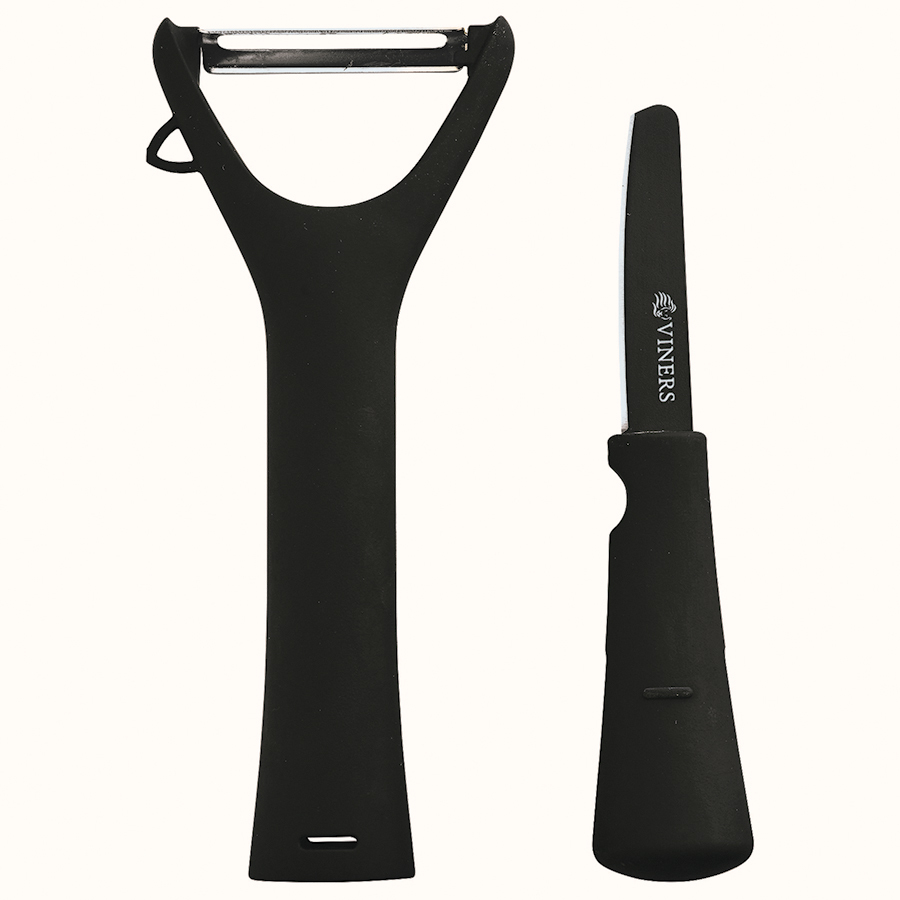 Нож для очистки овощей имеет закругленное безопасное лезвие. В комплект входит пластиковая насадка для хранения. Лезвие ножа имеет специальное покрытие, сводящее к минимуму трение при нарезке. Овощечистка позволяет не только чистить продукты, но и слегкостью удалять картофельные глазки. Оба аксессуара оснащены мягкими ручками для удобного захвата. Гарантия 10 лет. Размеры: овощечистка 16.5 см, нож 9 см.