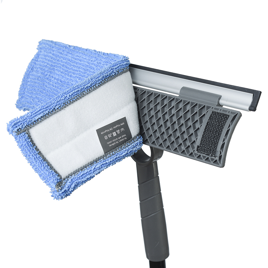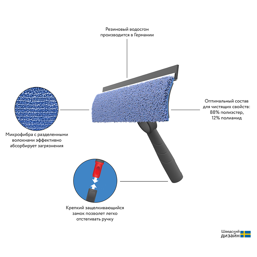 Швабра состоит из съемной микрофибровой насадки, в основе которой 88% полиэстера и 12% полиамида, а также сгона для воды, не оставляющего разводов. Для мытья окон в труднодоступных зонах стеклянных поверхностей и на большой высоте можно воспользоваться телескопической ручкой, которая приобретается отдельно. В комплект входит сменная насадка из микрофибры.