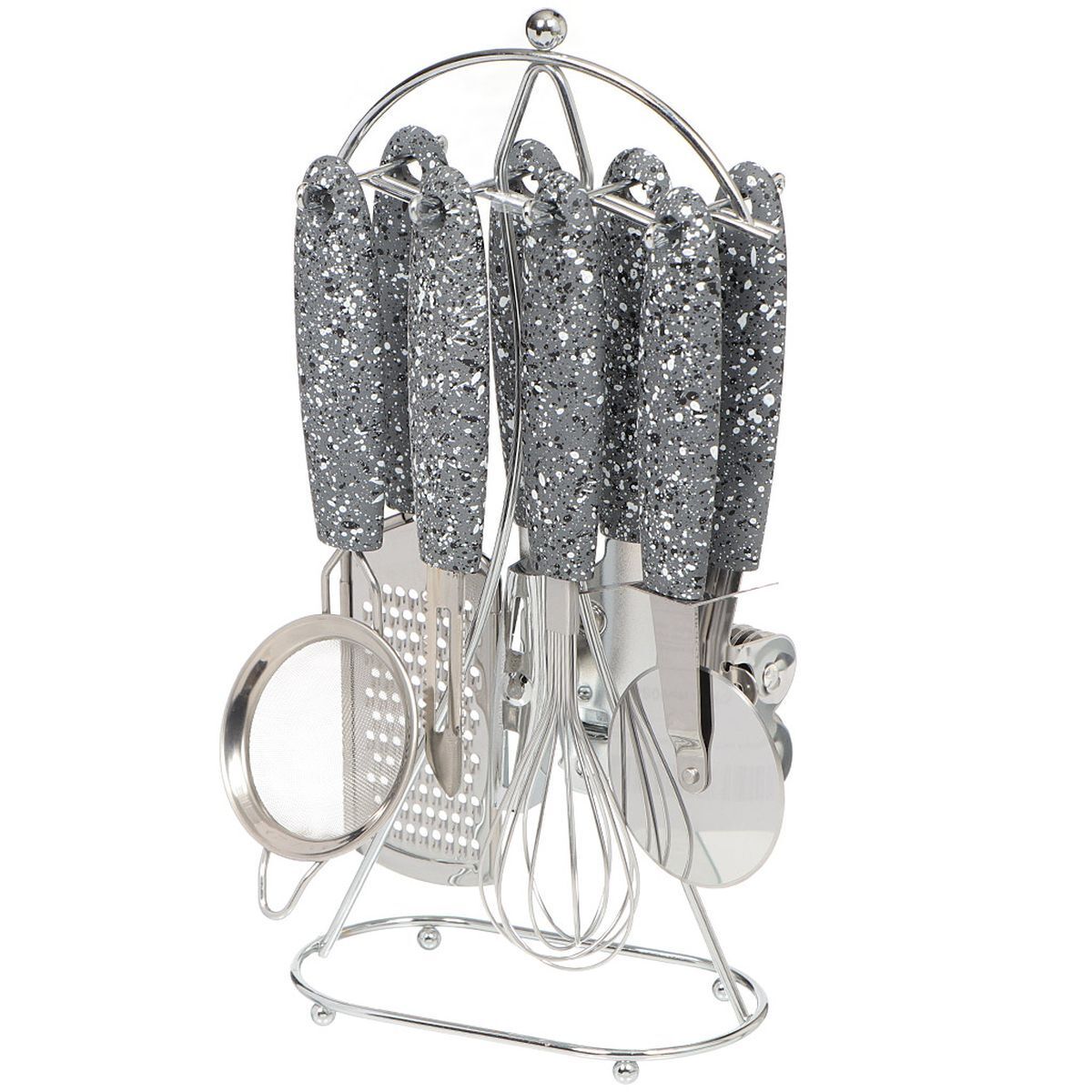 Набор включает в себя все самые необходимые кухонные принадлежности, а также удобную металлическую подставку для их хранения.