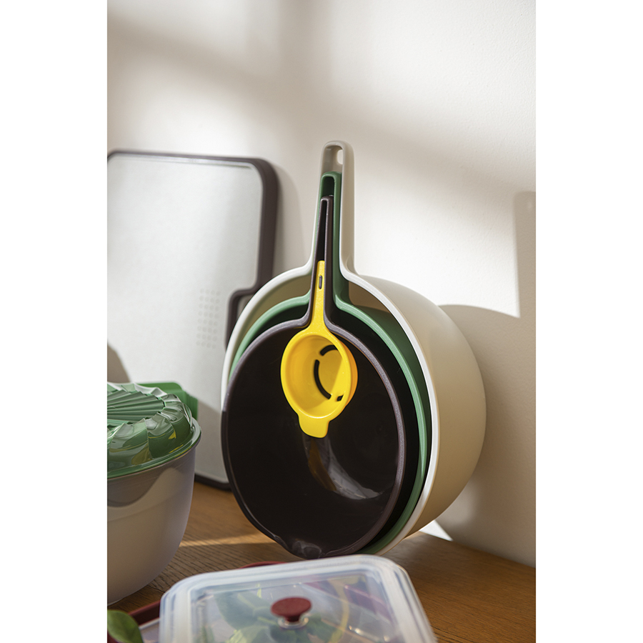 Набор Trym включает в себя две миски разного объема, дуршлаг и отделитель желтка. Этот комплект кухонных аксессуаров существенно облегчит процесс готовки и особенно пригодится при замешивании теста. Все предметы выполнены из практичного и долговечного полипропилена, поэтому легко очищаются от загрязнений и сохраняют привлекательный вид на протяжении всего срока службы. Глубокие чаши для смешивания оснащены удлиненными ручками для удобного захвата и специальными “носиками” для аккуратного переливания готовой смеси.