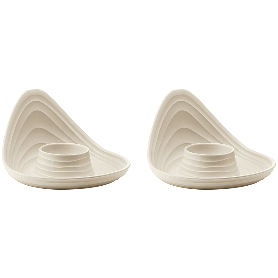 Подставки для яиц выполнены из переработанного пластика. Дизайн изделий напоминает керамику, а реалистичности внешнему виду придают тщательно подобранные пастельные тона и неровные круговые узоры, создающие эффект ручной работы.