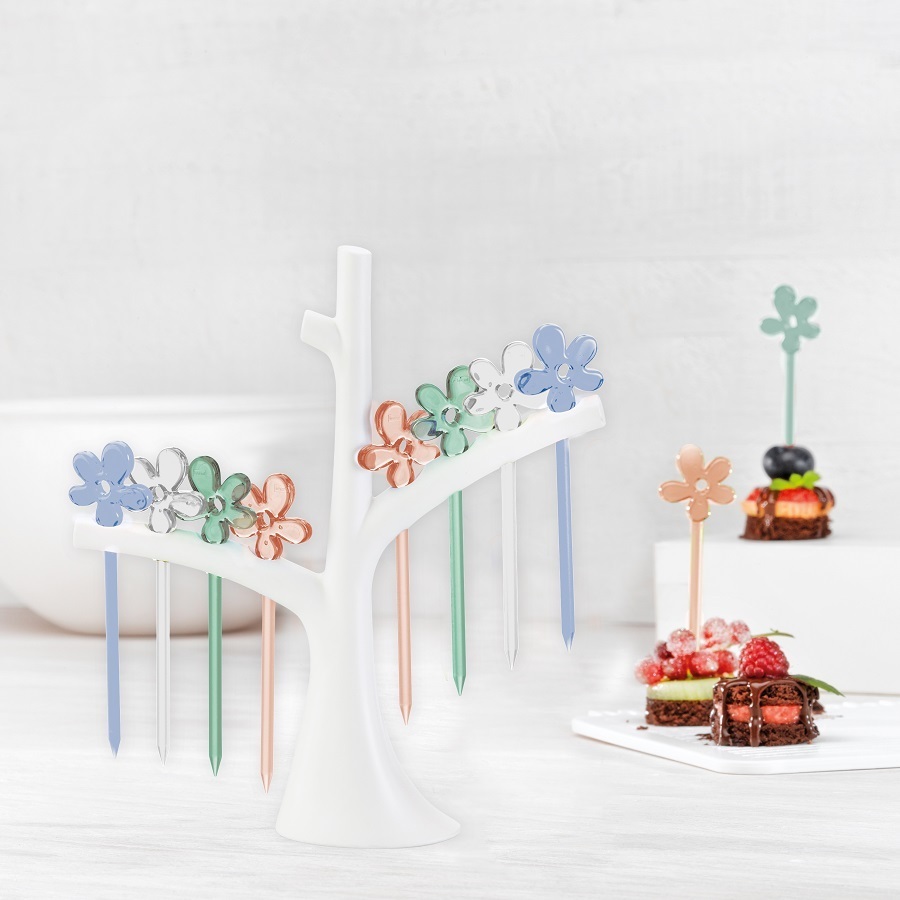 Набор шпажек с держателем A-PRIL станет незаменимым на любом застолье: с помощью разноцветных палочек можно красиво оформить оливки, ломтики сыра, канапе. Шпажки можно мыть в посудомоечной машине и использовать повторно длительное время. Набор посталяется с подставкой в виде дерева. Особенности: - экологически чистый материал - может использоваться неограниченное количество раз - яркие расцветки Производство: Германия