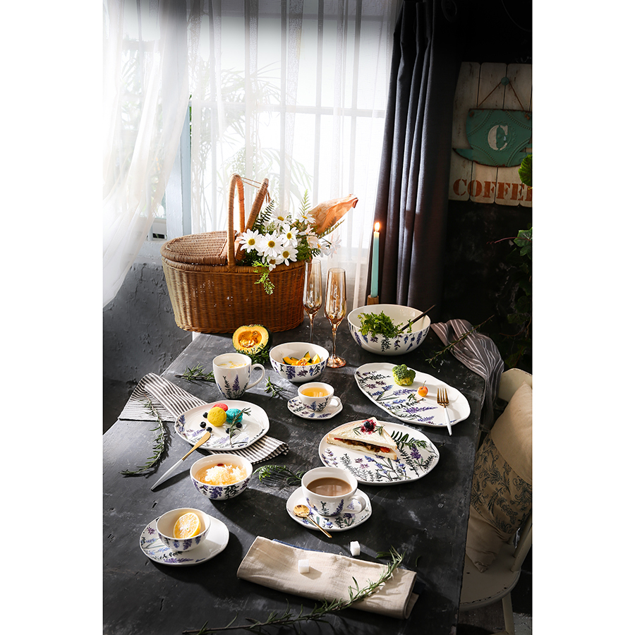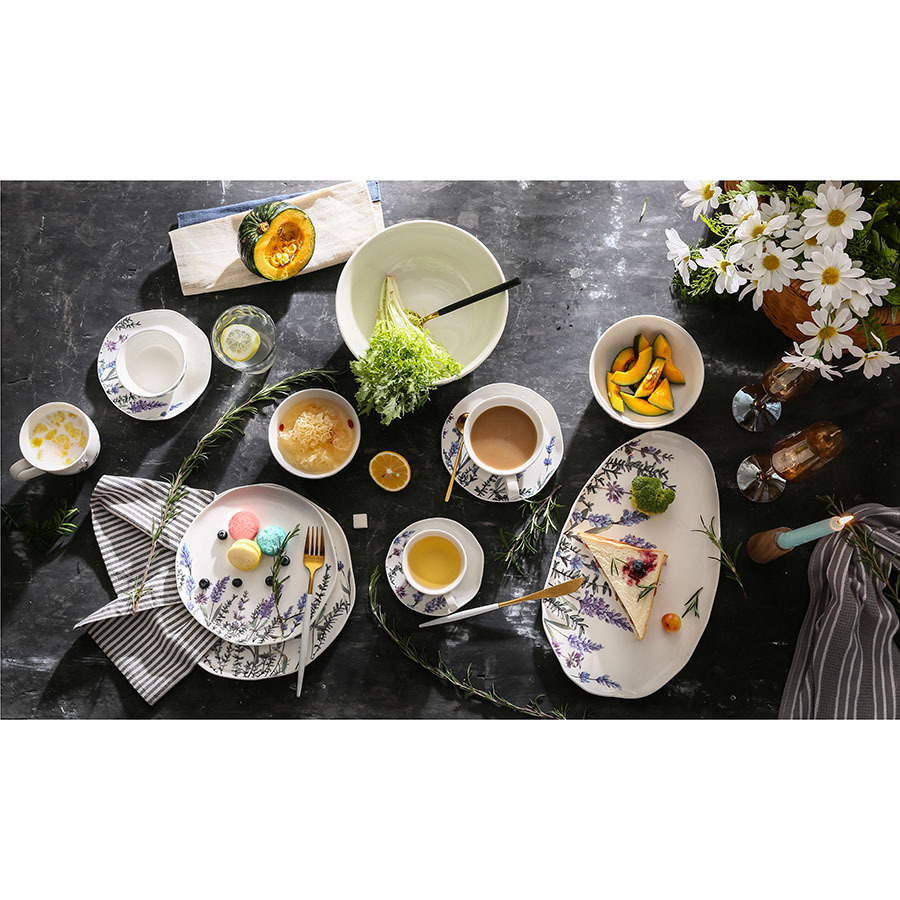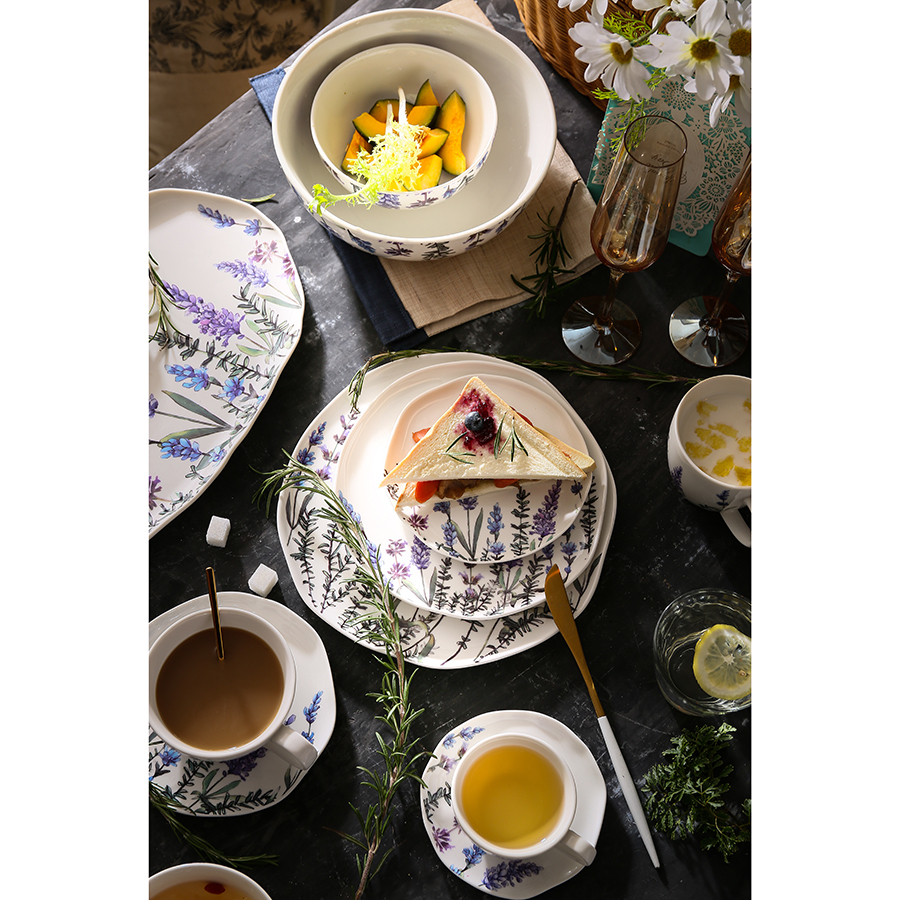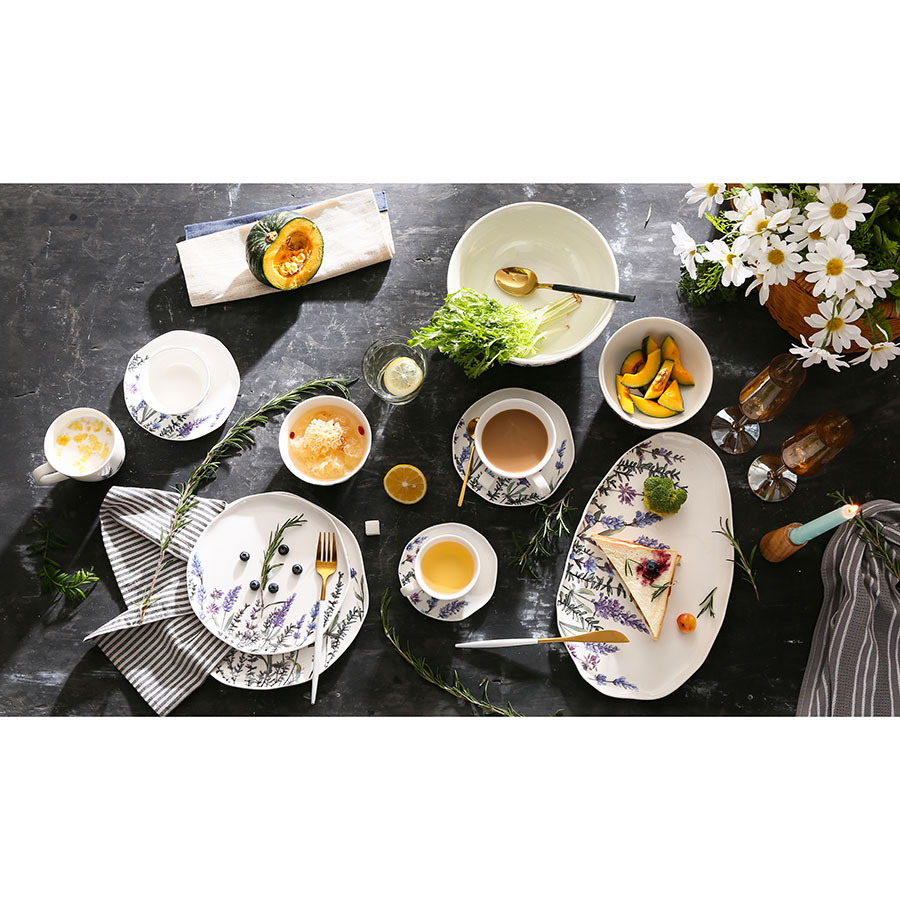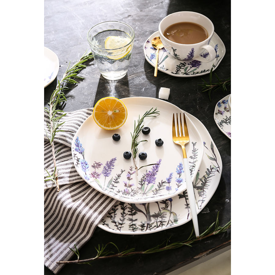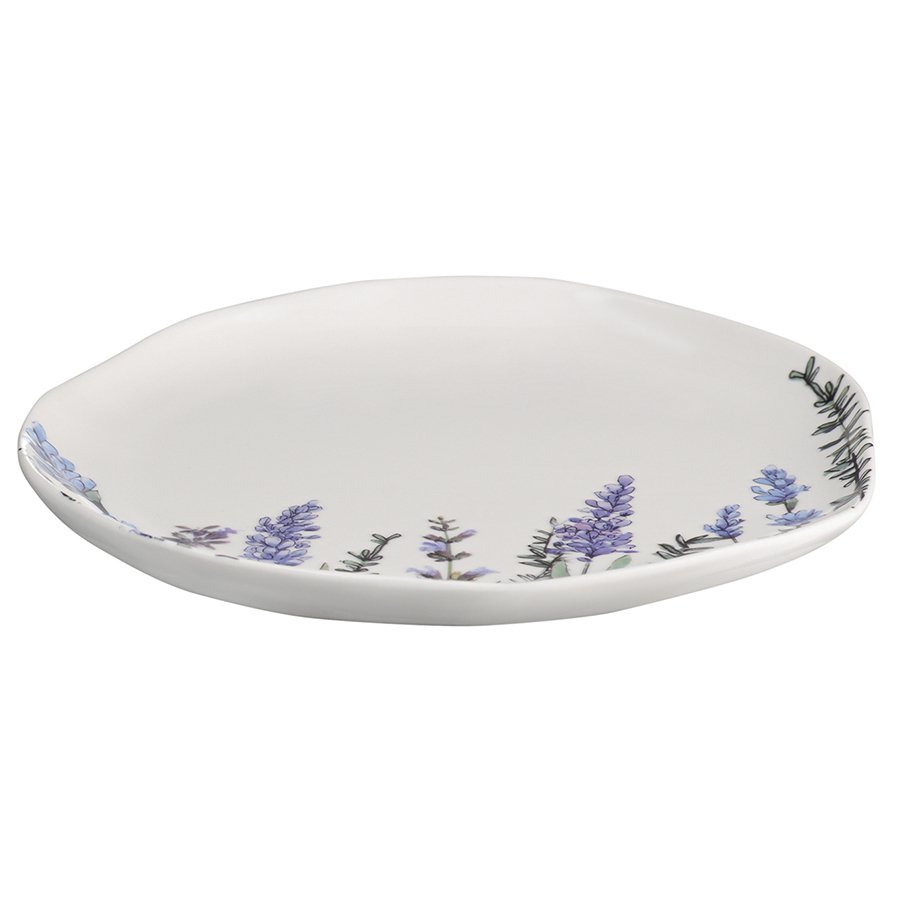 Тарелки для сервировки из фарфора Floral – прекрасный вариант для всех, кто ценит сочетание качества и эстетики. Цветущая лаванда, изображенная на белоснежной поверхности, превращает посуду в настоящее украшение стола. Материал изготовления неприхотлив в уходе, не впитывает загрязнения, является экологичным и безопасным для здоровья.