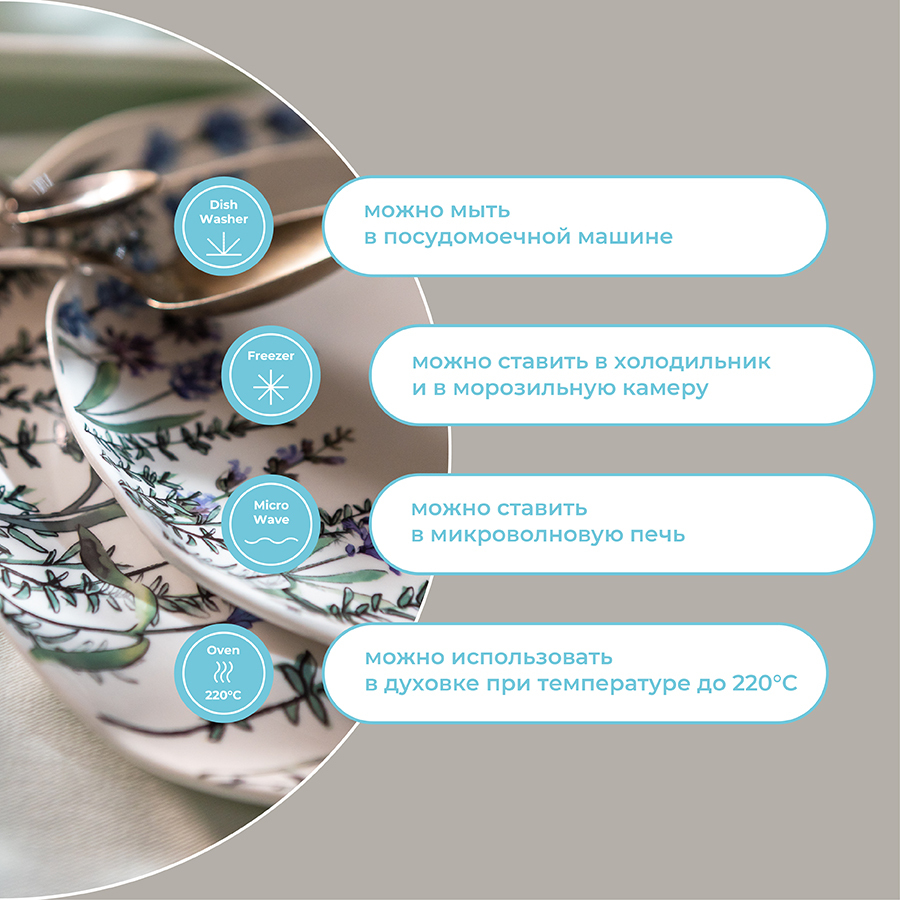 Чистое сырье высочайшего качества и собственная формула глазуровки с обжигом при температуре 1250 °C делают изделия из фарфора особо прочными, устойчивыми к растрескиванию и появлению сколов. Глазурь и декор не тускнеют со временем, сохраняя первоначальный цвет и блеск. Наши продукты прошли испытания на отсутствие в составе свинца и кадмия в соответствии со стандартными тестами FDA.