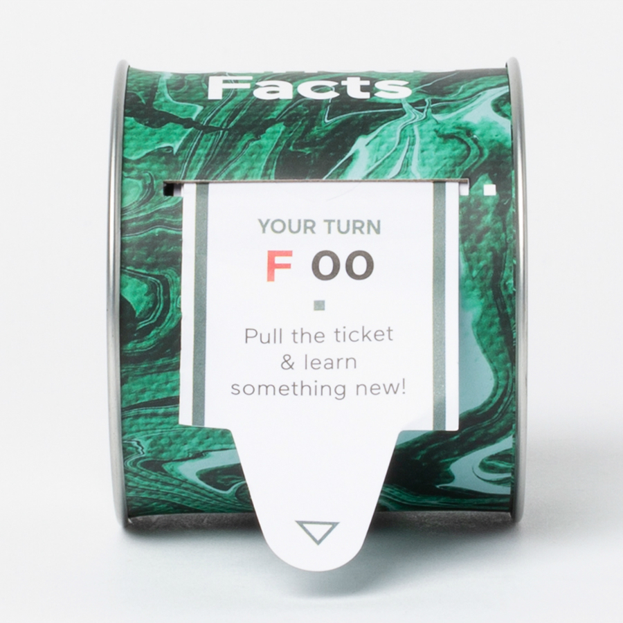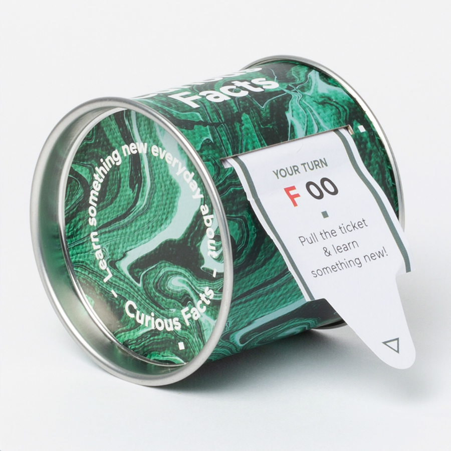 Дизайн: Набор «Узнай что-то новое. Любопытные факты» – прекрасный сувенир для тех, кому интересно познавать мир. Внутри жестяной банки в виде рулона расположены отрывные бумажные карточки, на каждой из которых написан один любопытный факт. Соберите вместе друзей или всю семью и проведите интересный вечер за изучением тайн и фактов, о которых вы раньше даже не подозревали. Материал: жесть, бумага.