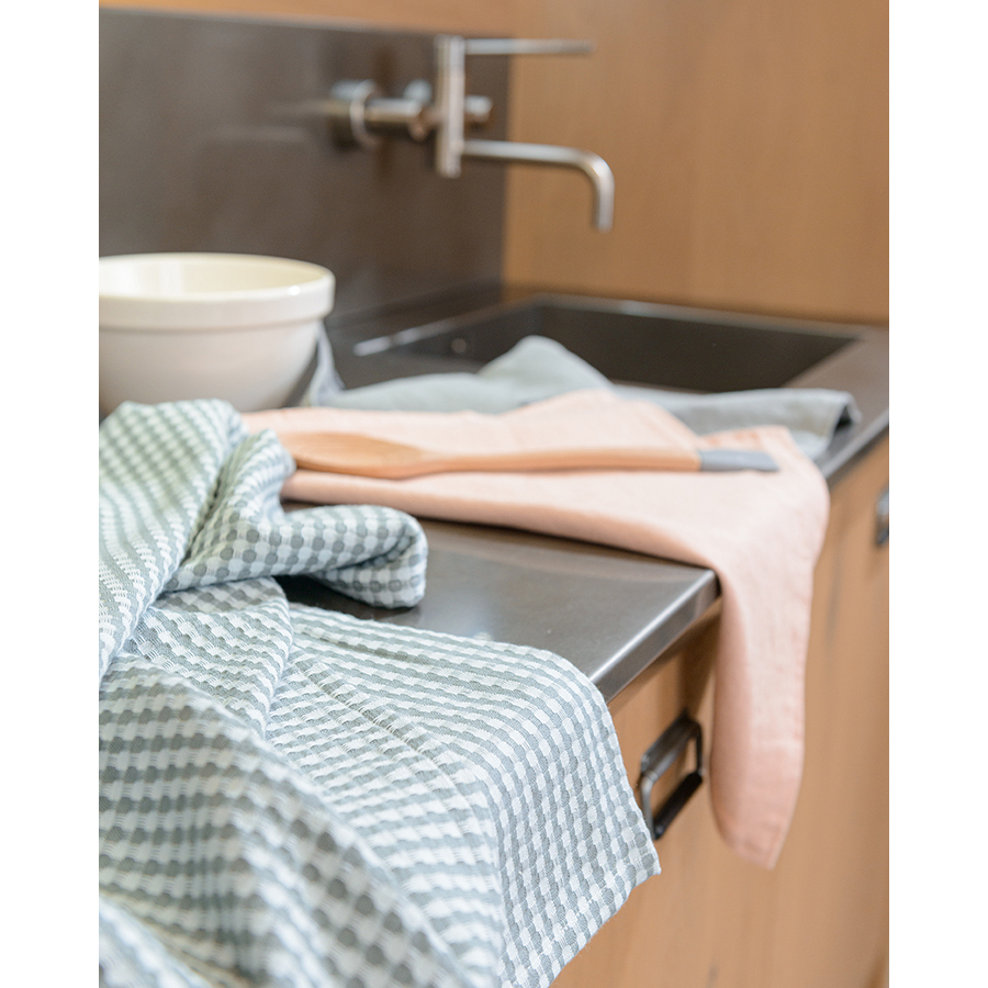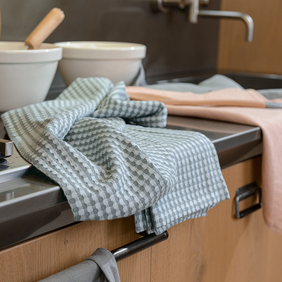 Кухонное полотенце выполнено из умягченного хлопка. Из такого же материала – окантовка в тон, благодаря которой изделие не деформируется даже после множества стирок. Легкий и при этом прочный вафельный текстиль отлично впитывает влагу и быстро сохнет. В комплекте – две однотонные модели базового серого цвета.