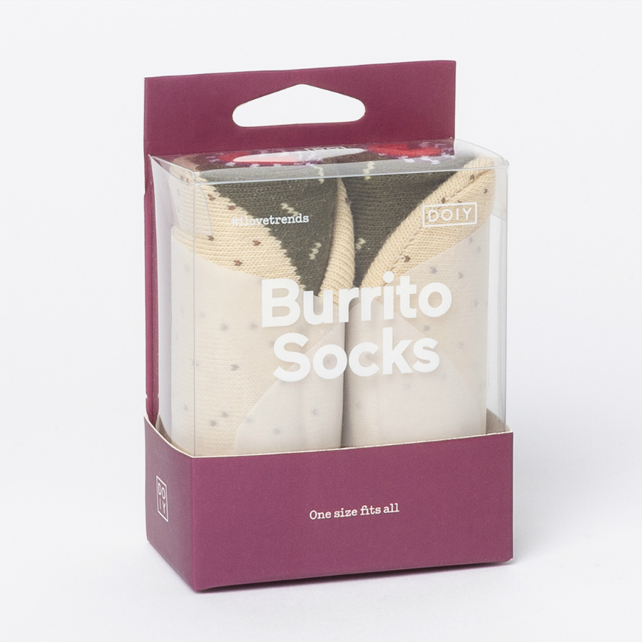 Дизайн: Носки Burrito – элегантный и стильный подарок себе или тем, кто ценит чувство юмора. Интересная упаковка в виде бурито совершенно неожиданно оказывается такими традиционными и необходимыми всем и каждому ежедневно, носками. Материал изготовления изделия приятный на ощупь, прекрасно тянется, поэтому презент подойдет как взрослому, так и ребенку или подростку. Оригинальоный и стильный принт носков дополнит общую картину необычного презента.