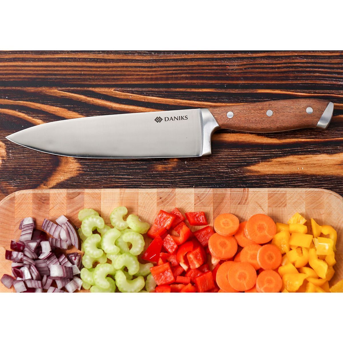 Daniks Wood - шеф-нож, который имеет изящную форму и высокопрочное лезвие из нержавеющей стали. Он подойдет как для новичка, так и для настоящего профессионала. Прекрасное соотношение цены и качества.
