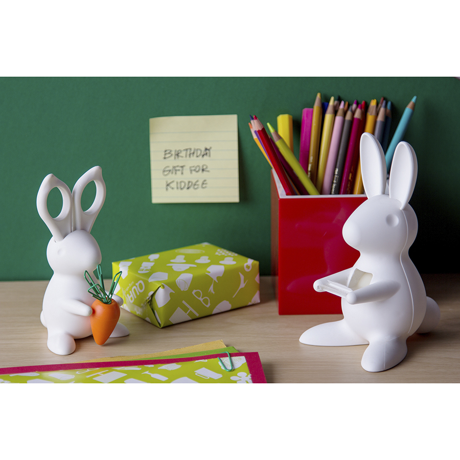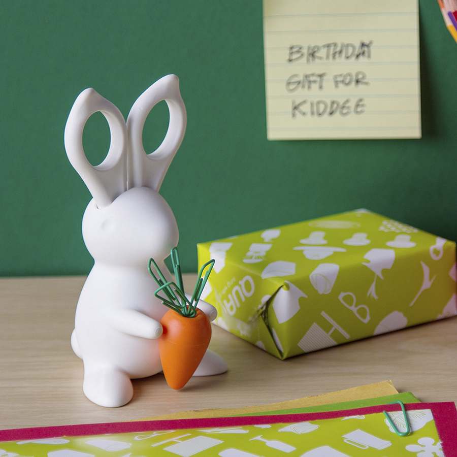 Зайчик 2 в 1! Это и острые ножницы - ушки и хорошенький диспенсер для скрепок в виде магнитной морковки. После того как закончатся, входящие в комплект скрепки, Вы можете использовать любые другие, желательно зеленого цвета:)