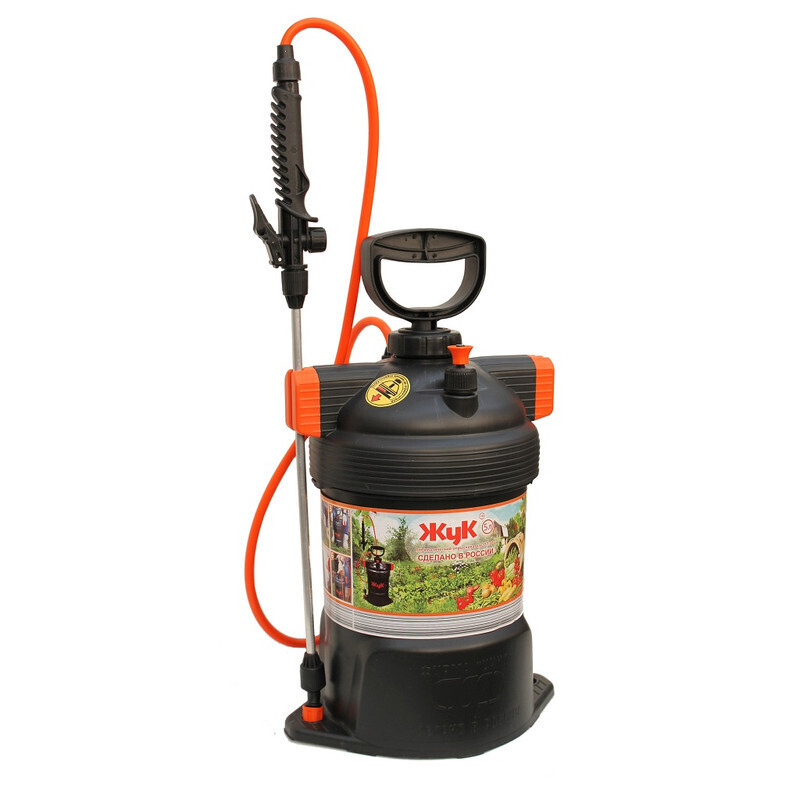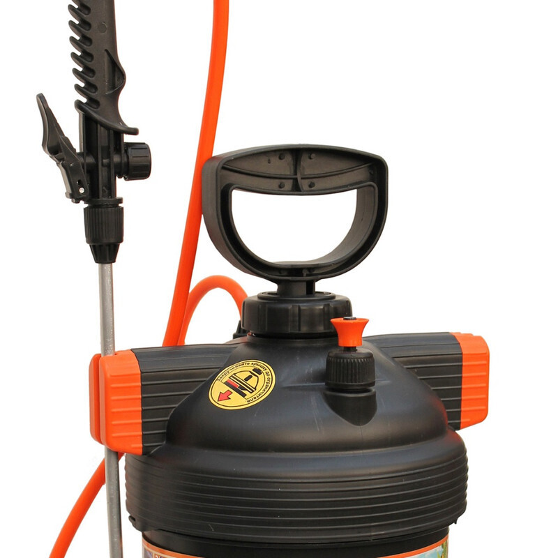 Мерная шкала на баке показывает остаток содержимого. Предохранительный клапан срабатывает при избыточном давлении, что обеспечивает безопасность в процессе эксплуатации опрыскивателя. Алюминиевый брандспойт надежен и удобен в применении. Регулировка струи на брандспойте даёт возможность использовать опрыскиватель как для защиты растений от вредителей, так и для полива.