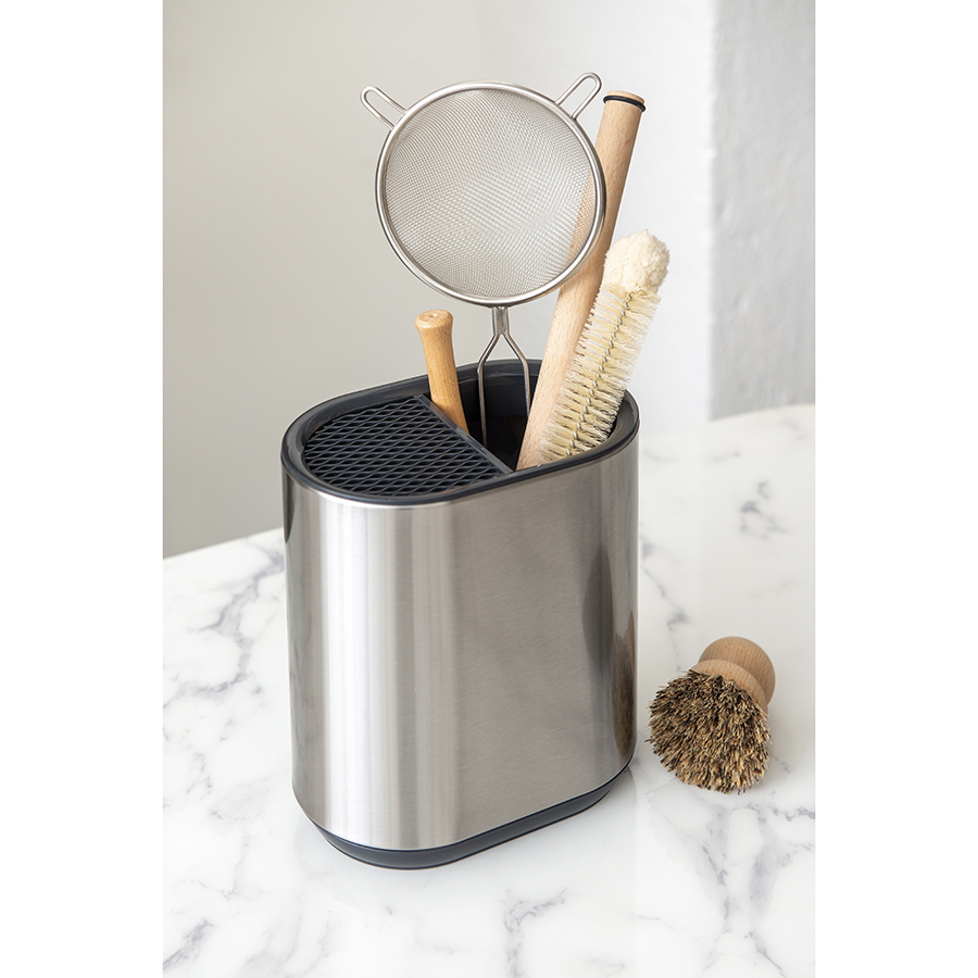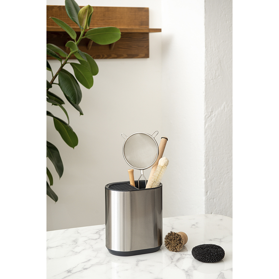 Atle – стильный органайзер для кухонных принадлежностей со специальным отделением для безопасного хранения ножей. Корпус изделия выполнен из практичного и устойчивого к износу АБС-пластика и нержавеющей стали. Покрытие имеет защиту от отпечатков пальцев. Компактные размеры позволяют размещать контейнер в любом удобном месте.