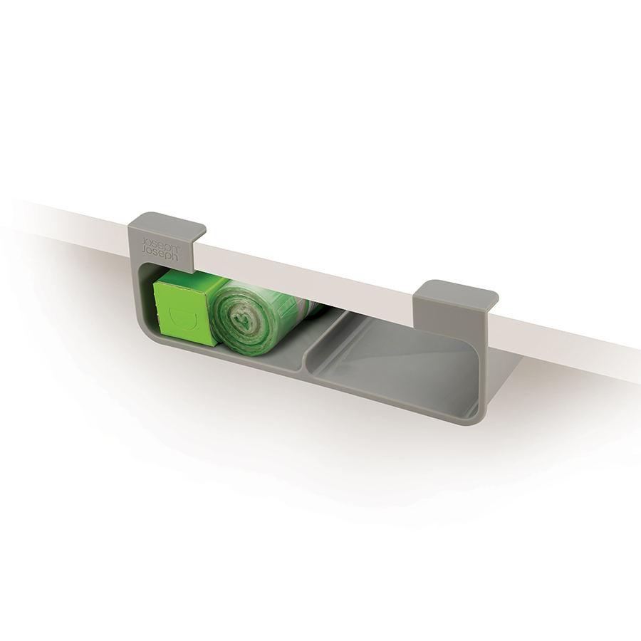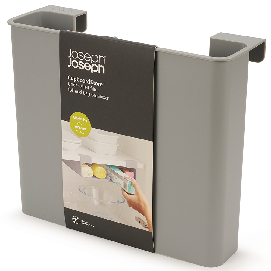Этот подвесной органайзер помогает использовать пространство под полкой шкафа. Аксессуар подходит для хранения пищевой пленки, фольги, бумаги для выпечки или мусорных пакетов.