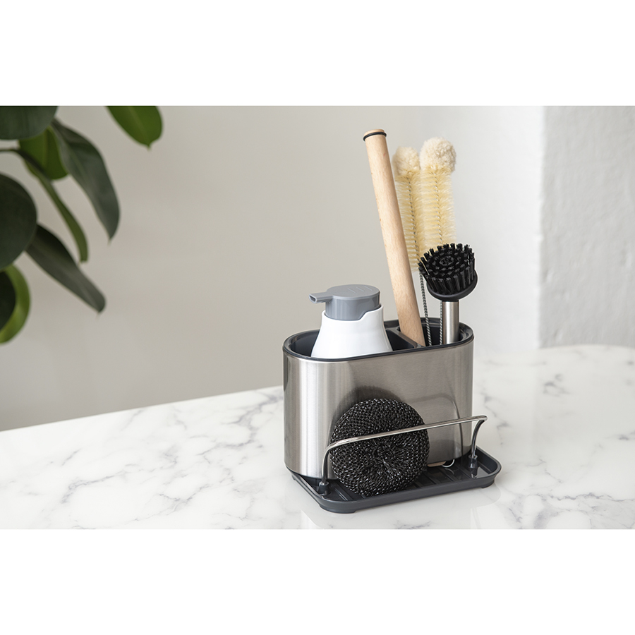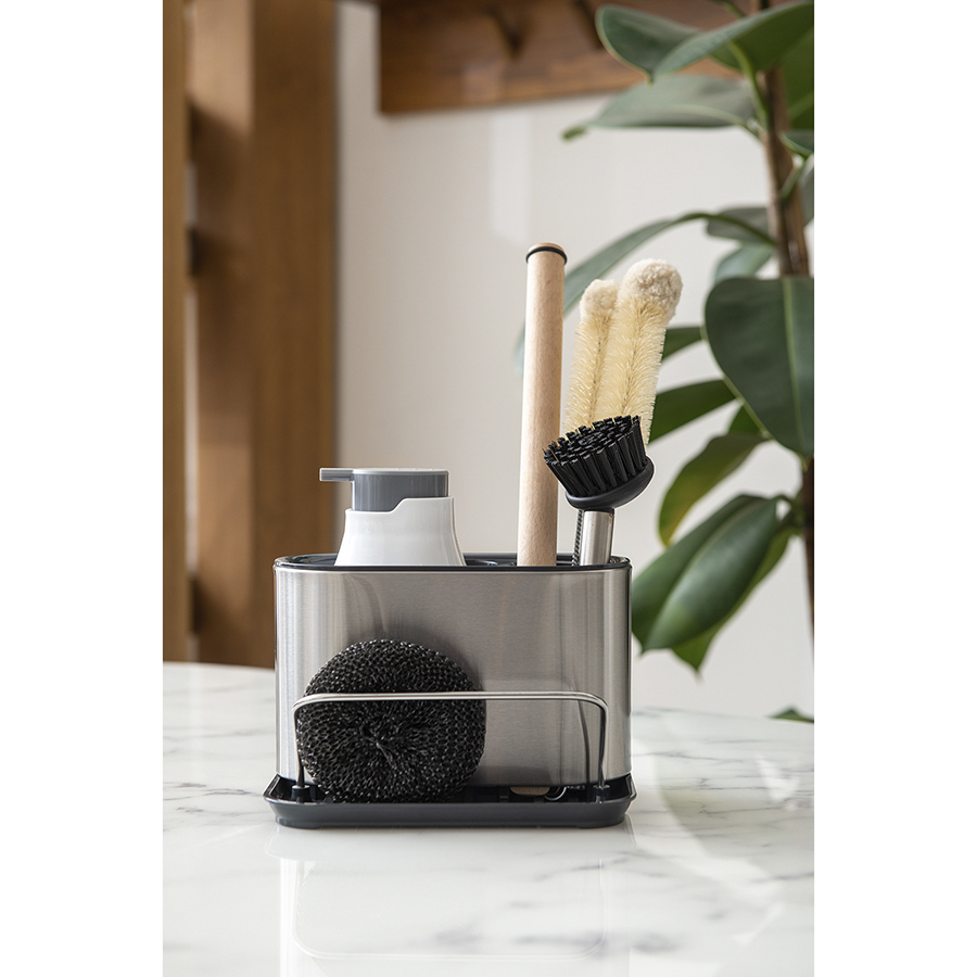 Органайзер Atle позволяет компактно разместить средство для мытья посуды, губку, щетку и другие предметы для уборки кухни непосредственно на мойке или на столешнице. Изделие выполнено из прочного и устойчивого к износу АБС-пластика и нержавеющей стали. Стильный контейнер в универсальном цветовом решении органично вписывается в различные варианты оформления интерьера.
