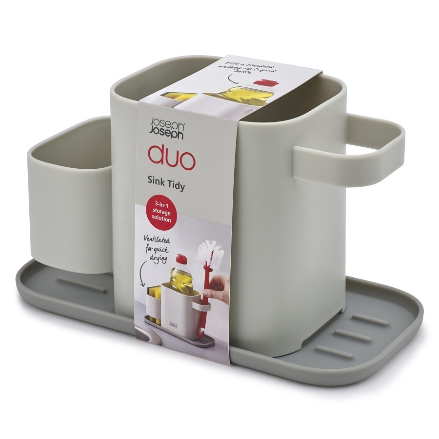 Органайзер для раковины Duo – идеальное решение для кухни, которое поможет организовать все необходимые предметы и средства для мытья посуды в одном месте. В контейнере поместятся щетки, губки, тряпки, бытовая химия. Внизу под подставкой для мелких аксессуаров предусмотрен лоток для сбора воды. Конструкция не занимает много места возле кухонной мойки. Размер – 30,5х13х15 см.