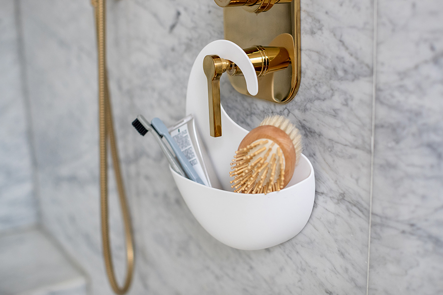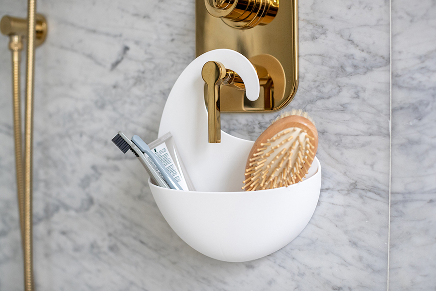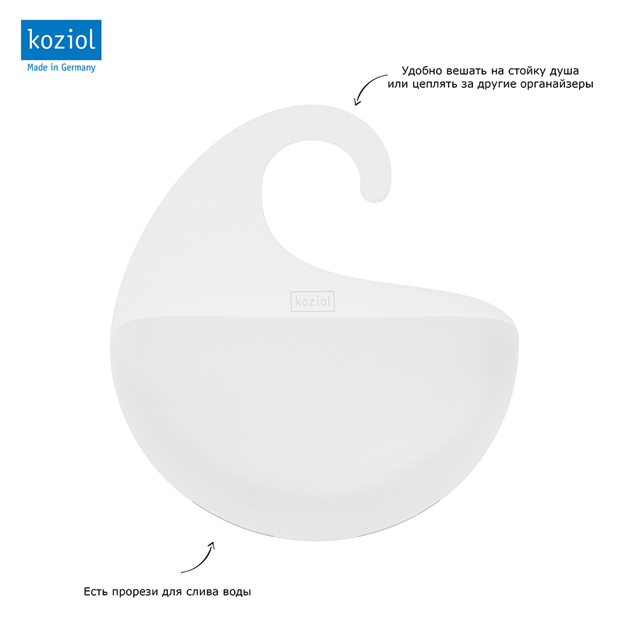 Органайзер Surf с крючком в виде волны можно повесить на стойку душа или кран. Две прорези на дне органайзера выполняют две функции: не дают воде застаиваться и позволяют цеплять органайзеры друг за друга.