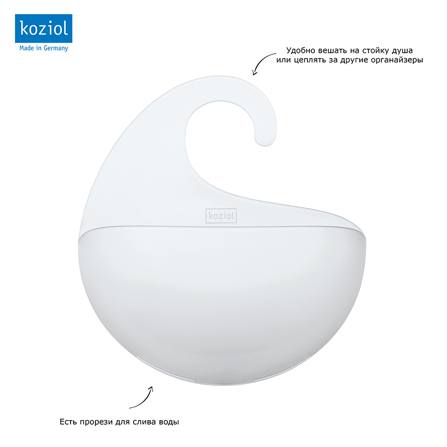 Органайзер Surf с крючком в виде волны можно повесить на стойку душа или кран. Прорези на дне выполняют несколько функций: не дают воде застаиваться и позволяют цеплять органайзеры друг за друга. Особенности: - могут соединяться друг с другом - прорези для слива воды Производство: Германия