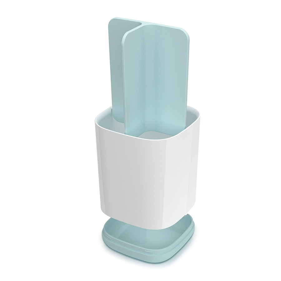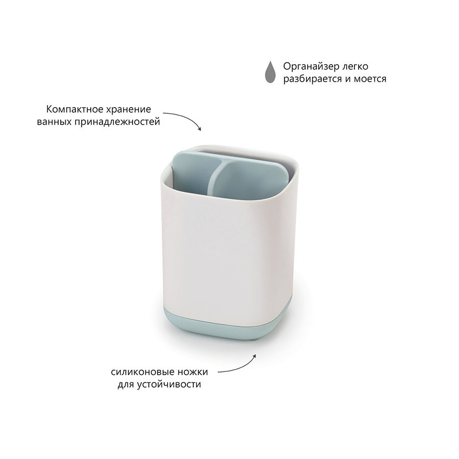 Конструкция и дизайн органайзера делают его универсальным контейнером для хранения всех предметов гигиены полости рта. Теперь все зубные щетки и тюбики с пастой вы можете хранить в одном месте, и они всегда будут под рукой. Органайзер предусмотрен также для хранения электрических зубных щеток, которые, как правило, занимают дополнительное место в ванной. Теперь можно эффективнее использовать пространство ванной комнаты и поддерживать все в чистоте и порядке. В органайзере есть вентиляционные отверстия, позволяющие предметам быстро сохнуть. В контейнере не скапливаются капли влаги, он остается сухим и сохраняет все предметы в прекрасном состоянии. Больше не нужно прилагать дополнительных усилий на протирание предметов после их использования. Сам органайзер очень легко разбирается и моется, поэтому уход за ним не займет много времени. На дне органайзера есть специальные силиконовые ножки. Этот материал не скользит по гладким поверхностям, что придает органайзеру дополнительную устойчивость. Ванная — одна из наиболее сложных для уборки комнат. Здесь вопрос экономии места особенно актуален. Для создания новых аксессуаров дизайнеры Joseph Joseph руководствовались принципами рационального использования пространства, эргономичностью и удобством сортировки.