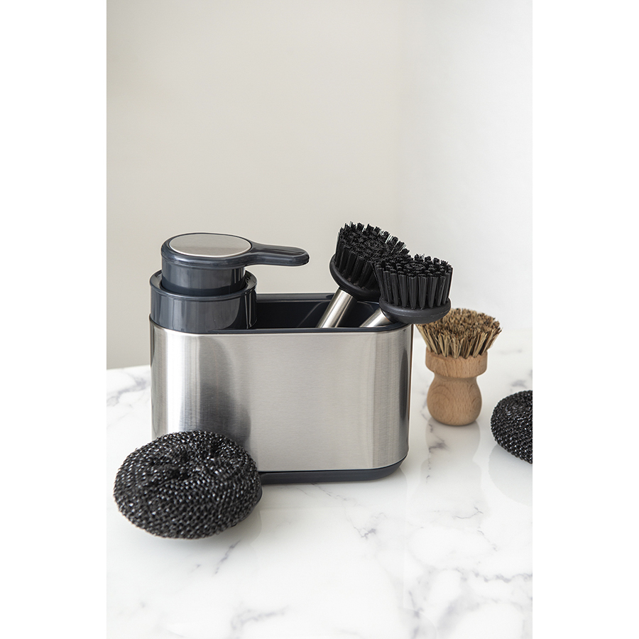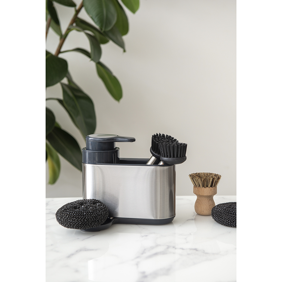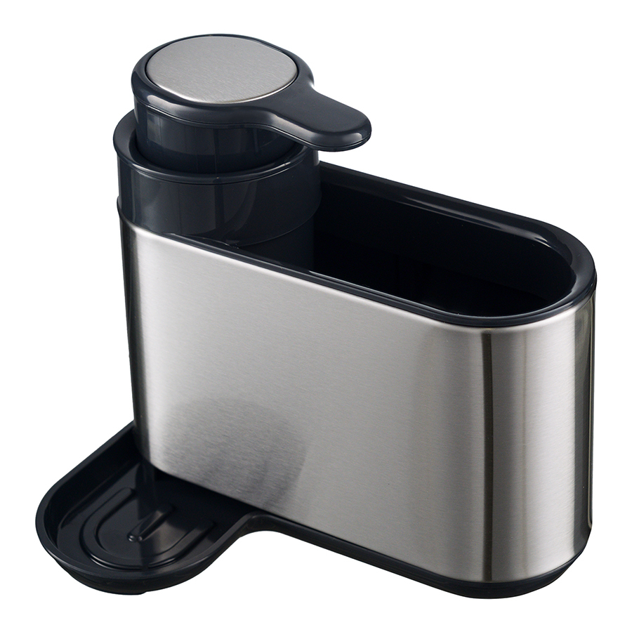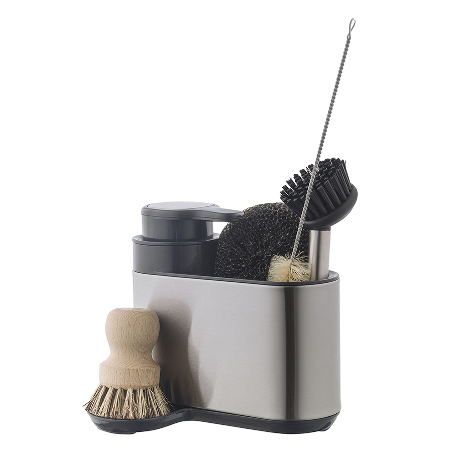 Органайзер Atle позволяет компактно разместить диспенсер с жидким средством, губку и щетку для мытья посуды на кухонной мойке или столешнице. Изделие выполнено из прочного и устойчивого к износу АБС-пластика и нержавеющей стали. Стильный контейнер в универсальном цветовом решении органично вписывается в различные варианты оформления интерьера.