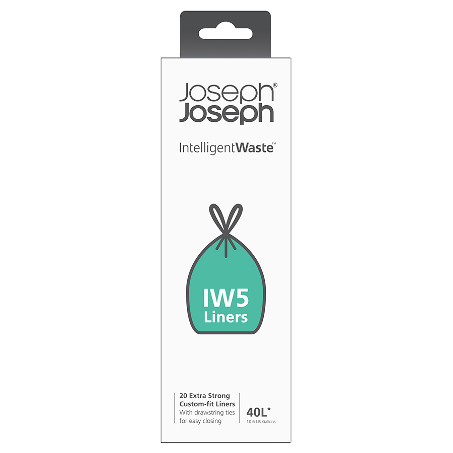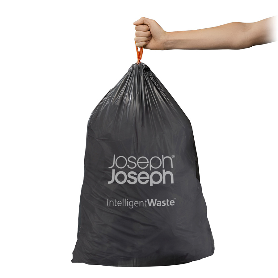 Пакеты от Joseph Joseph представляют собой особо прочную конструкцию из пластика с двойным швом и шнурком для удобного завязывания. Изделия подходят для утилизации всех видов бытовых отходов, вмещают в себя до 60 л прессованного мусора. Поставляются в удобной упаковке для компактного хранения и перевозки.