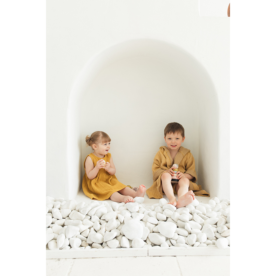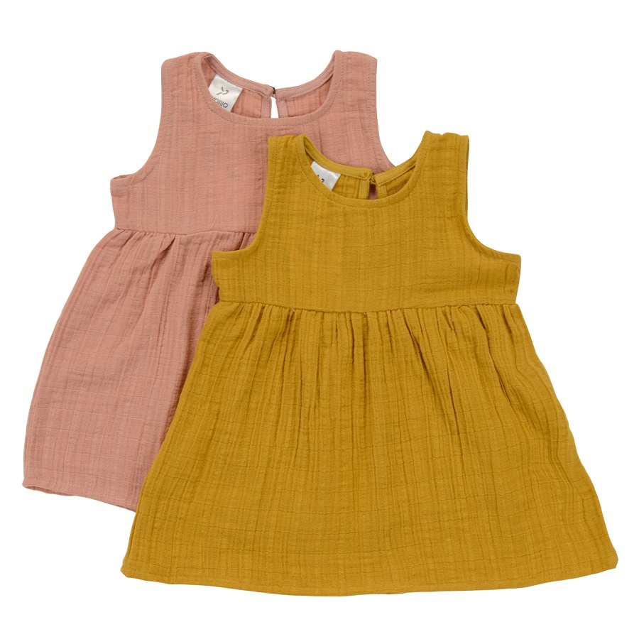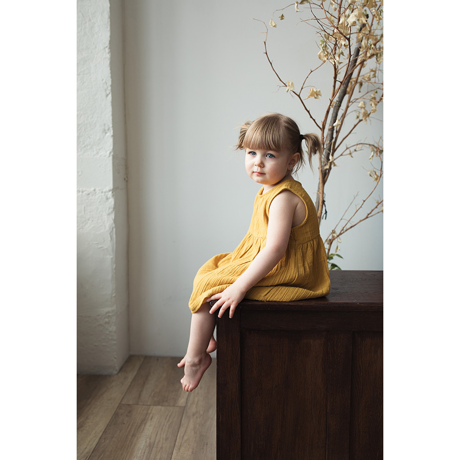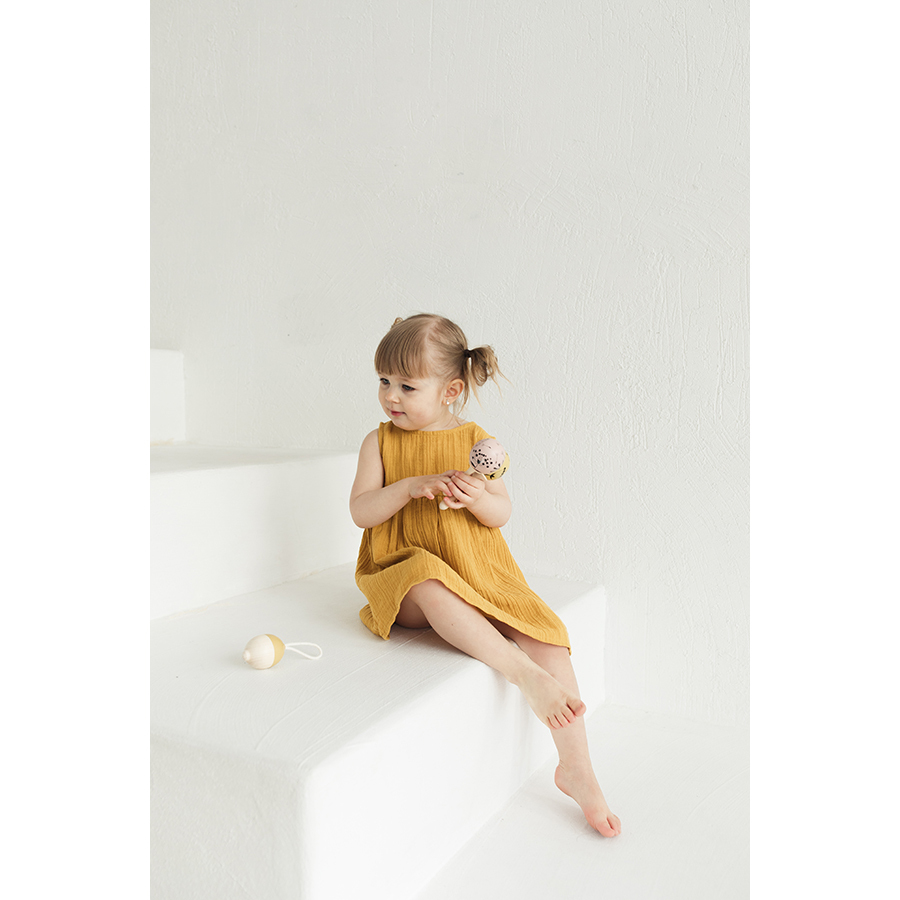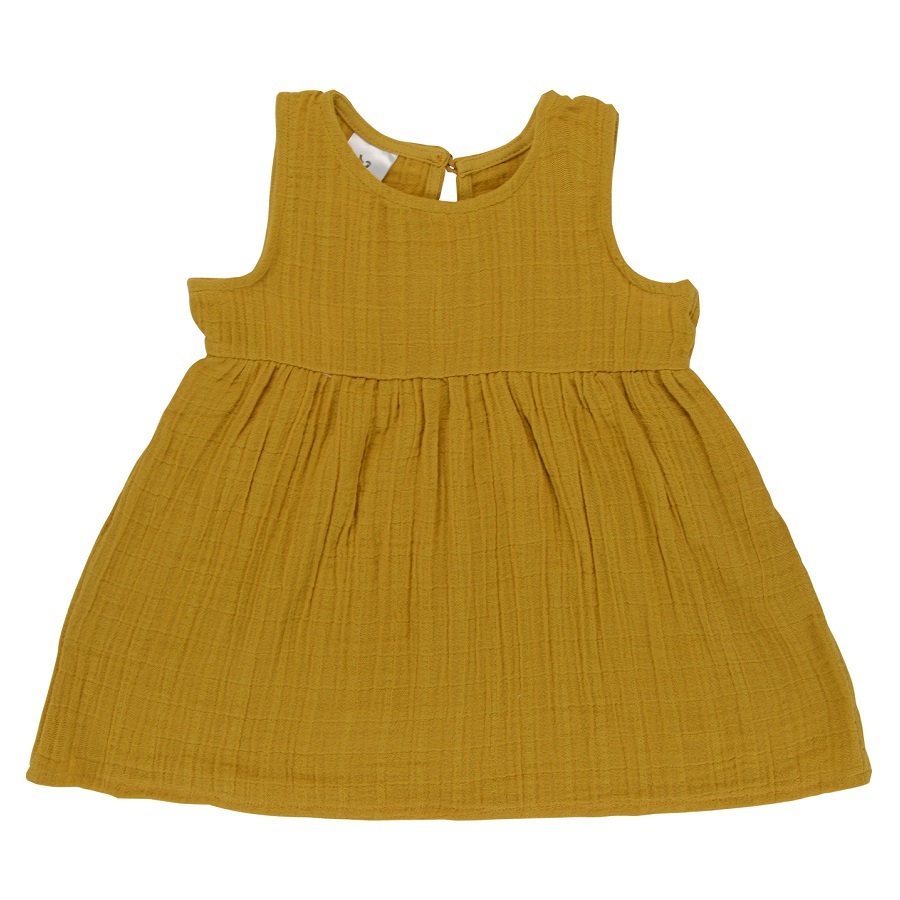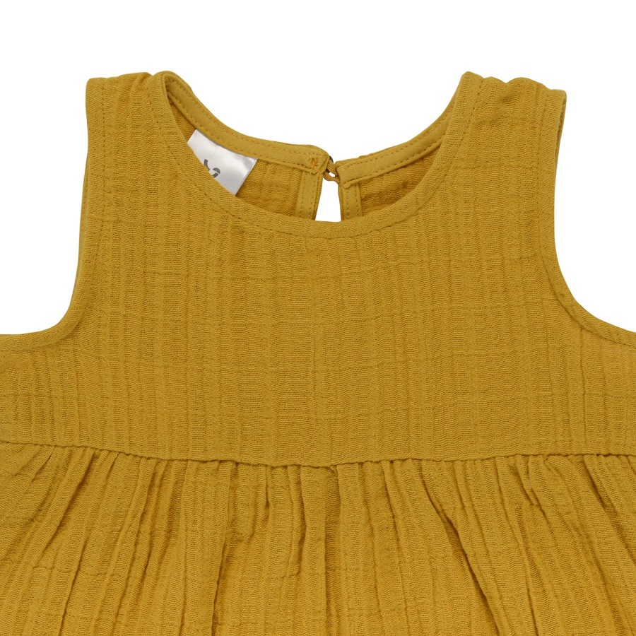 Платье без рукава из хлопкового муслина горчичного цвета из коллекции Essential универсального дизайна и базовой расцветки. Благодаря застежке сзади на пуговицу, платье легко надевать и снимать. Круглый вырез горловины отделан косой бейкой. Завышенная линия талии подчеркнута юбкой на сборке.