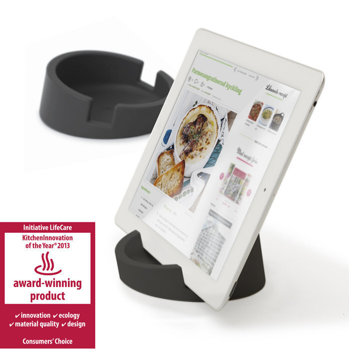 Специальная подставка для современных поваров и просто любителей вкусно и весело готовить. Интересный дизайн был разработан специально для того чтобы вписаться в любой кухонный интерьер. Слушать музыку, смотреть видео, искать рецепт – все можно делать с одного устройства во время готовки. Планшет может располагаться как стоя, так и лежа, подходит как к стандартным моделям, так и к их мини-версиям. Полностью изготовленная из силикона подставка исключает любую возможность скольжения, а планшет надежно в ней зафиксирован.